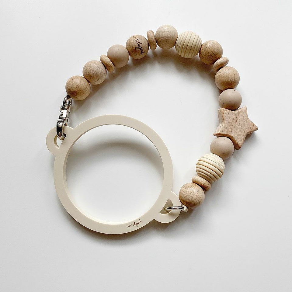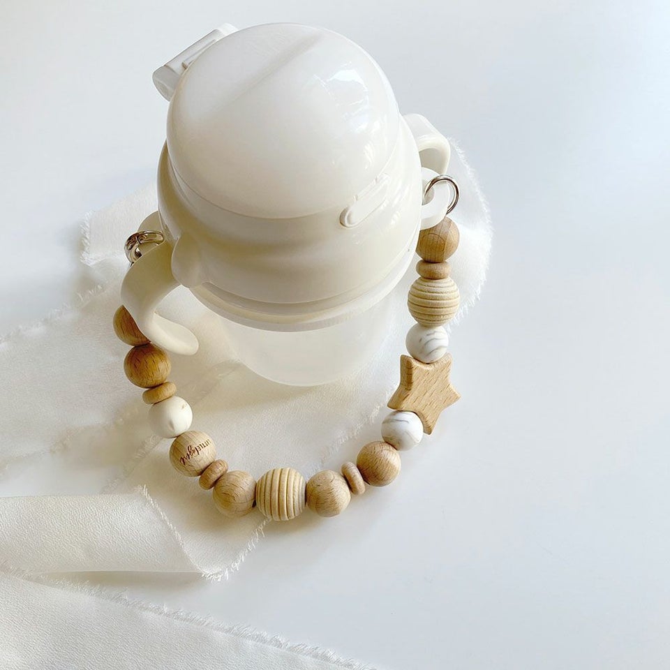 星ビーズのストラップデザイン、ナチュラルベージュのラバーリング、シンプルなデザインのマグホルダー。