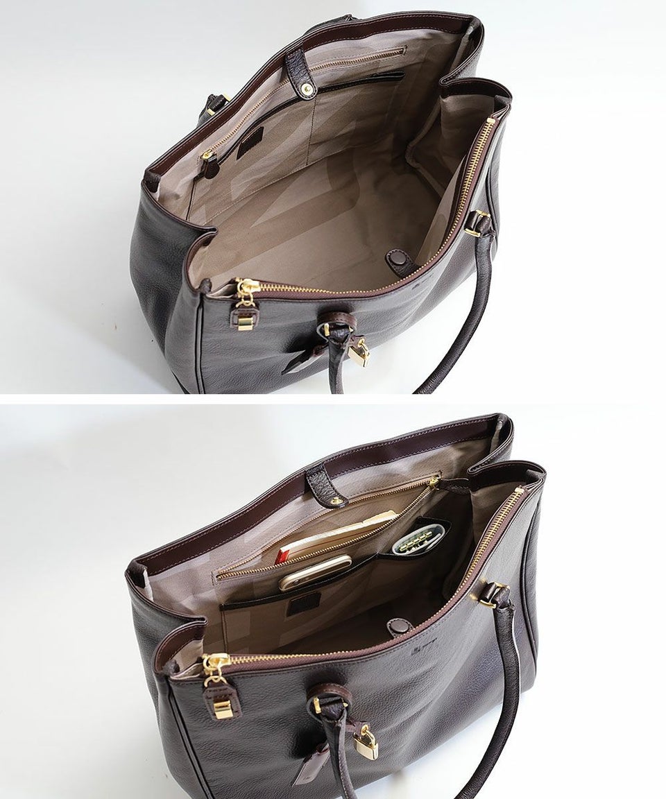 バッグの口元前面のファスナーポケットは付属のブリッジ金具にセットすると南京錠でロックできます。