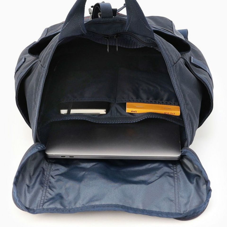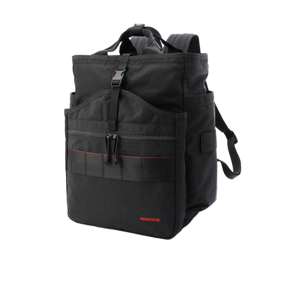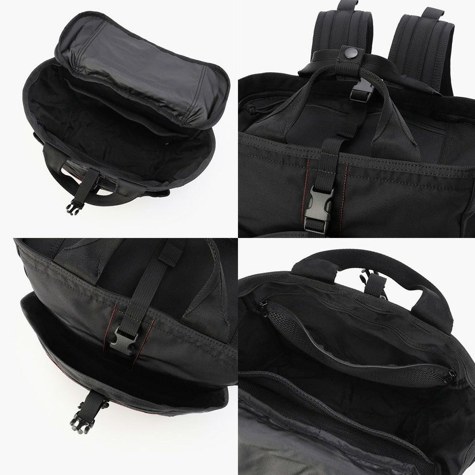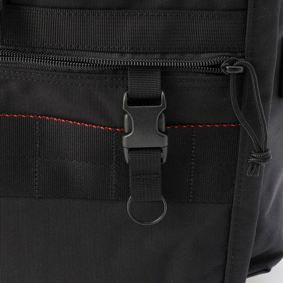フロントにはストラップで留める構造のポケットを配置。かさばるアイテムやテニスラケットなども固定可能で、ビジネスからアクティブシーンまで幅広く対応します。
