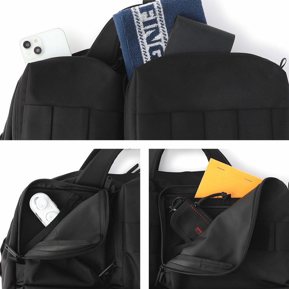 マチ付きのフロントポケットや立体ポケットを複数備え、使用頻度の高い小物を素早く取り出せます。上部ポケットは細かな仕分けに対応し、下部ポケットには折り畳み傘やボトルも収納可能です。
