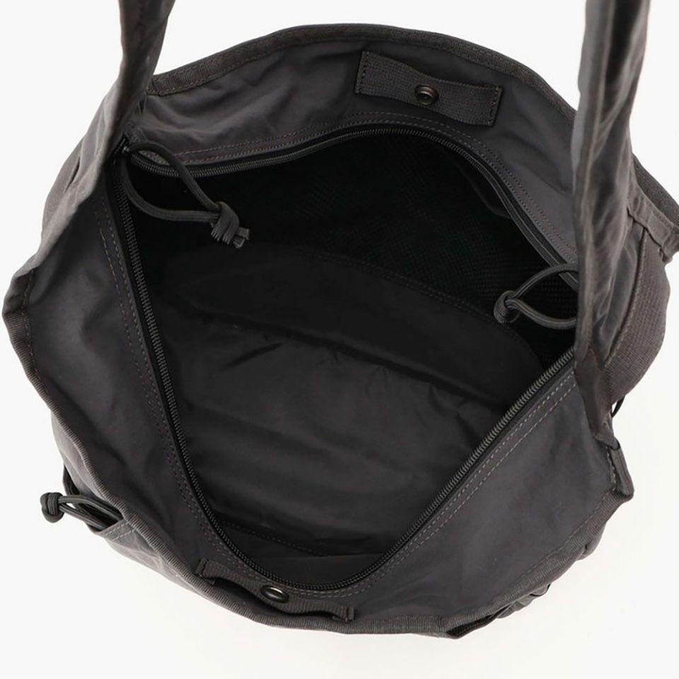 特徴的なショルダーストラップや生地の風合いを活かし、フロントは隠しポケットを左右に配置。