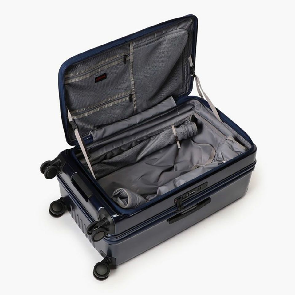 開き方を自由に調整できるフロントパネルを採用。ホテルのベッドや壁際など限られたスペースでも荷物の出し入れがスムーズに行えます。旅先のストレスを減らす、実用性を追求したデザインです。