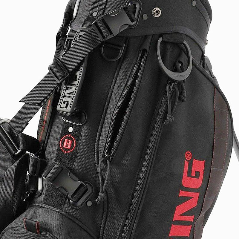 ゴルフボール1ダースを収納できるポケット、保冷機能を備えたボトルポケットなど多数配置。