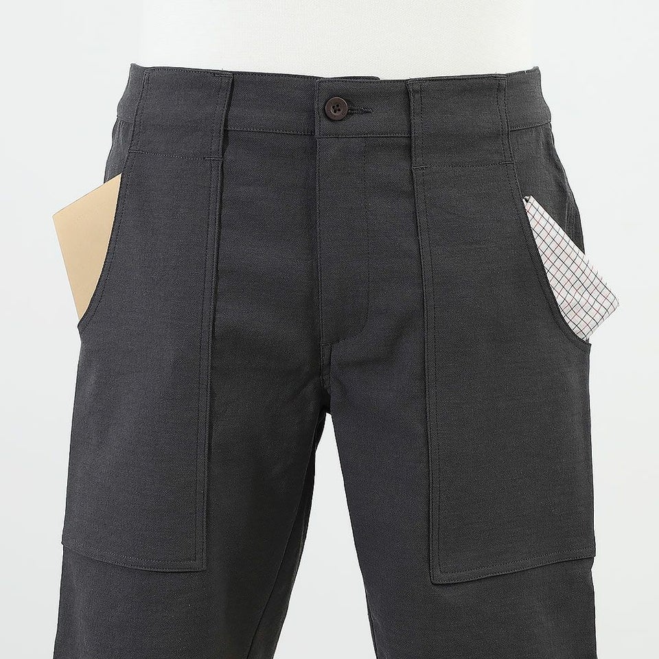 ワークパンツにみられるディテールを落とし込みながらも、品がよく都会的なルックスに仕立てています。