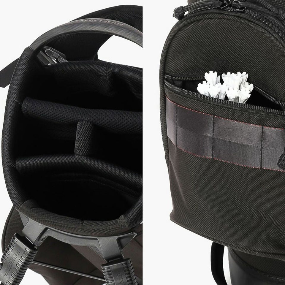 クラブの出し入れをスムーズにする新設計の口枠や、強度を高めたメッシュセパレーターを採用。スタンドシステムは軽量化と安定性を両立し、デザイン性と実用性の両面でアップデートされています。さらに、ショルダーパッドは背負いやすさを追求し、長時間の持ち運びも快適です。