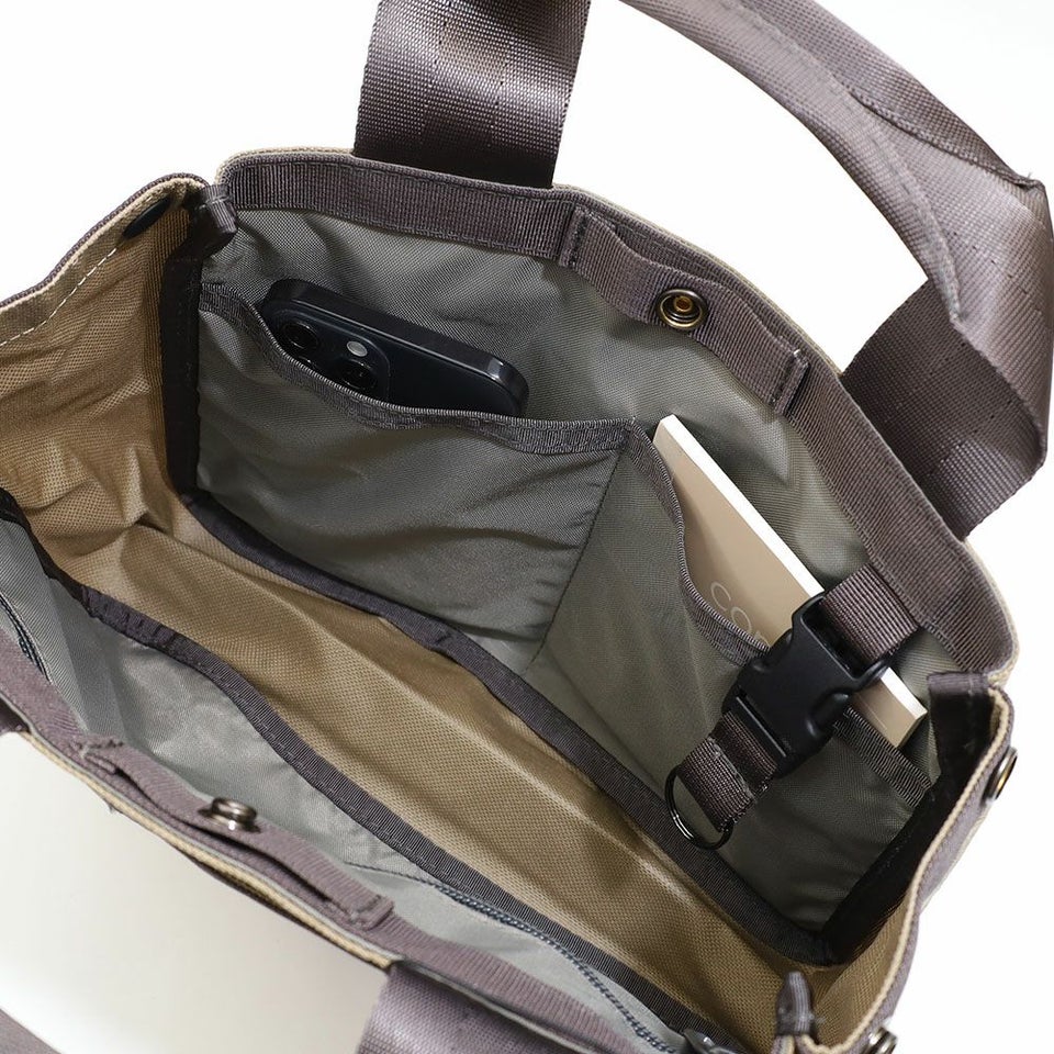 メイン収納部はマチ幅をしっかり確保し、見た目以上の収納力を発揮。さらに開口部の両側にスナップを備えており、荷物の量に合わせて間口を調節可能。使い勝手の良さを高めています。