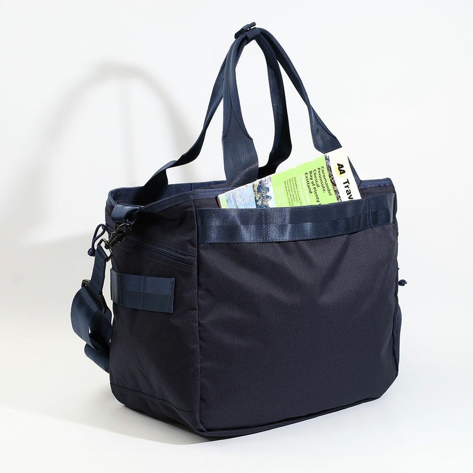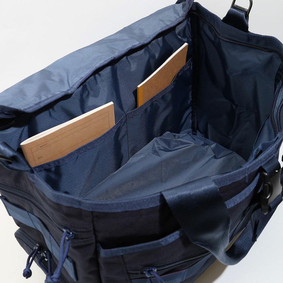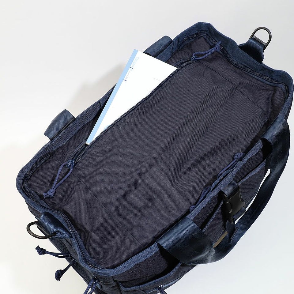広々としたメイン収納部は仕切りを少なくし、大きな荷物も出し入れしやすい構造に。視認性を高めた大きな開口部とファスナー式の天蓋で、中身をしっかり隠しつつスマートに収納できます。さらにスナップボタンでマチ幅を調整でき、荷物量に応じた使い分けも可能です。