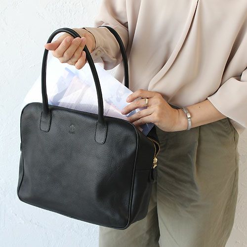 肩掛けもできる長さの華奢なハンドルが女性らしいデザインの薄マチボストンバッグ。スクエア型なので荷物がすっきりと収納しやすくなっています。A4サイズや500mlポットボトルも収納可能なたっぷり容量なので荷物の多い方にも安心。