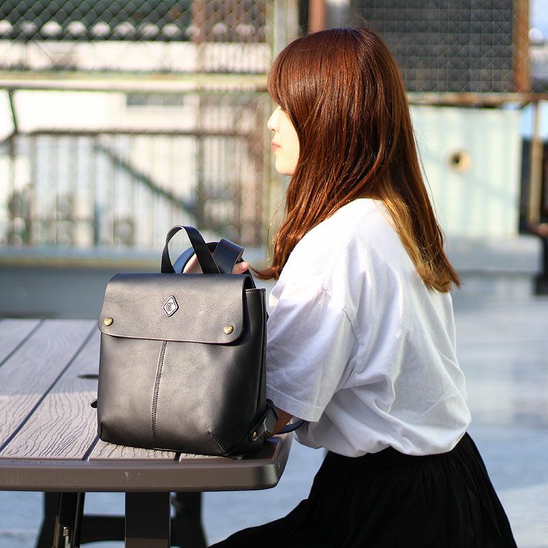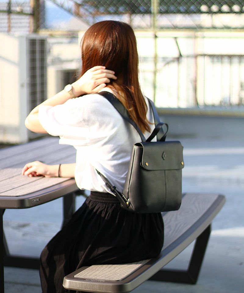 後ろ姿を大人可愛く演出するレザーリュックサック。