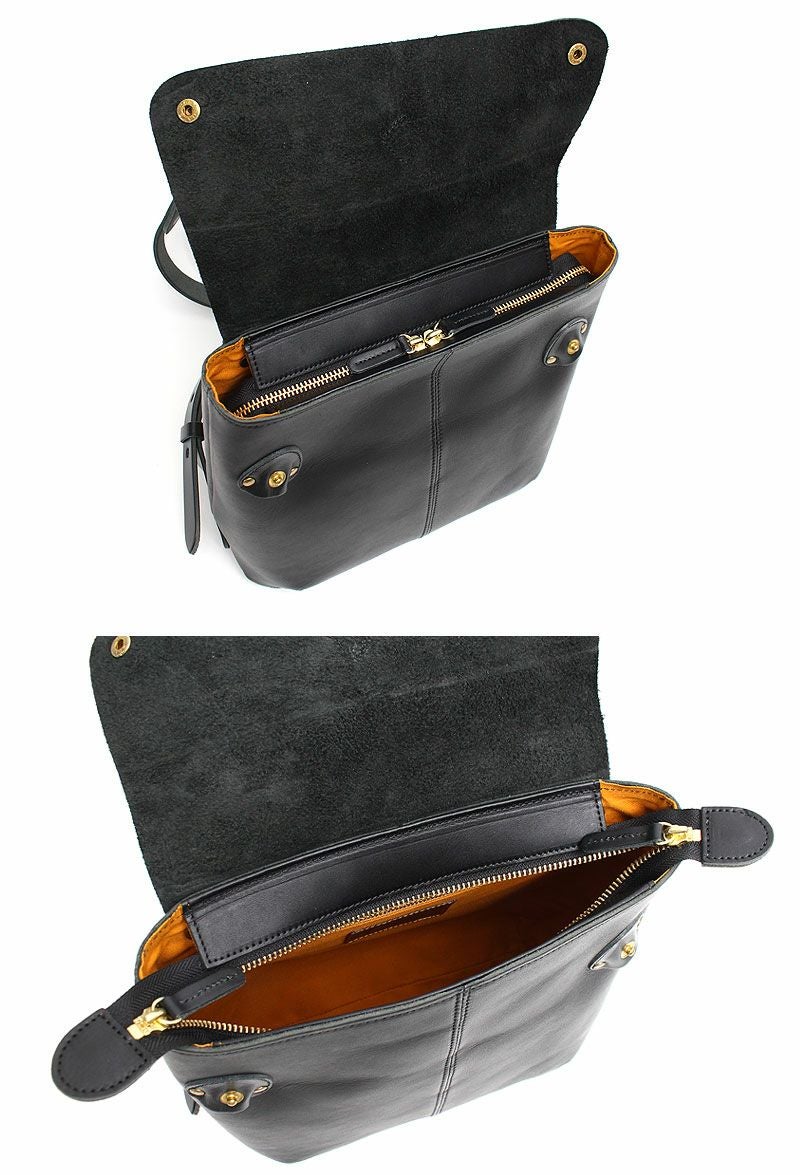 フラップを留めるスナップボタンは、指をかけやすいレザーパーツ付き。