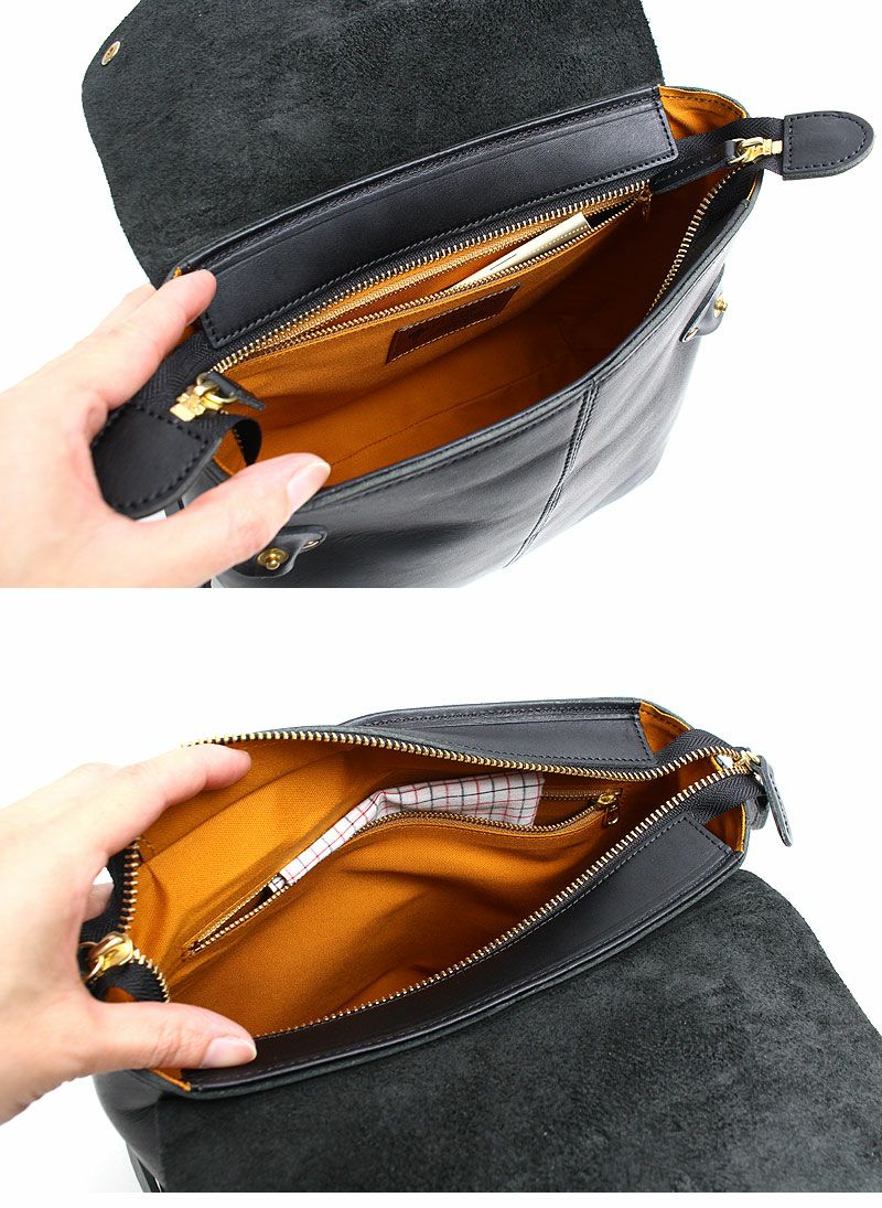 前後に一つずつファスナー付きのポケットも備えているので、中身の整頓もお手の物。内生地は全色共通で、中の荷物を見渡しやすく汚れも目立ちにくいマスタード色の綿生地です。
