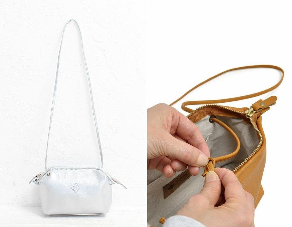 キュッと結んで長さ調節が可能なショルダーストラップは細めで結びやすく、バッグの中でかさ張らないのが嬉しいポイント◎