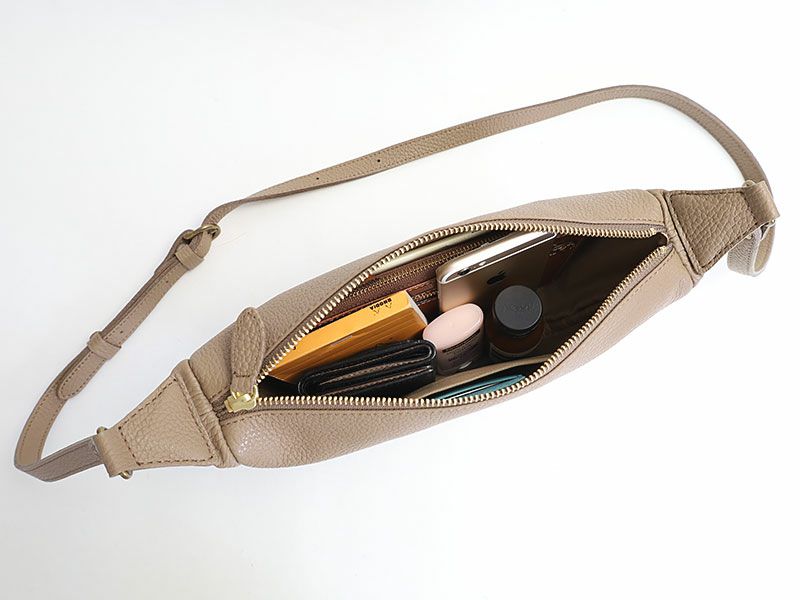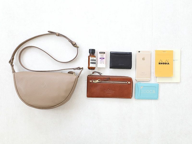 アクセサリー感覚で持てる小ぶりなサイズには、折り財布やハンカチ、ポーチ等の必要最小限の手回り品が収納可能。