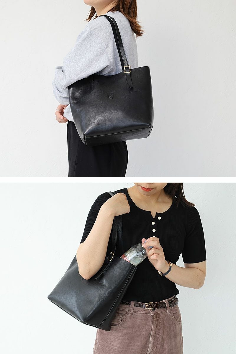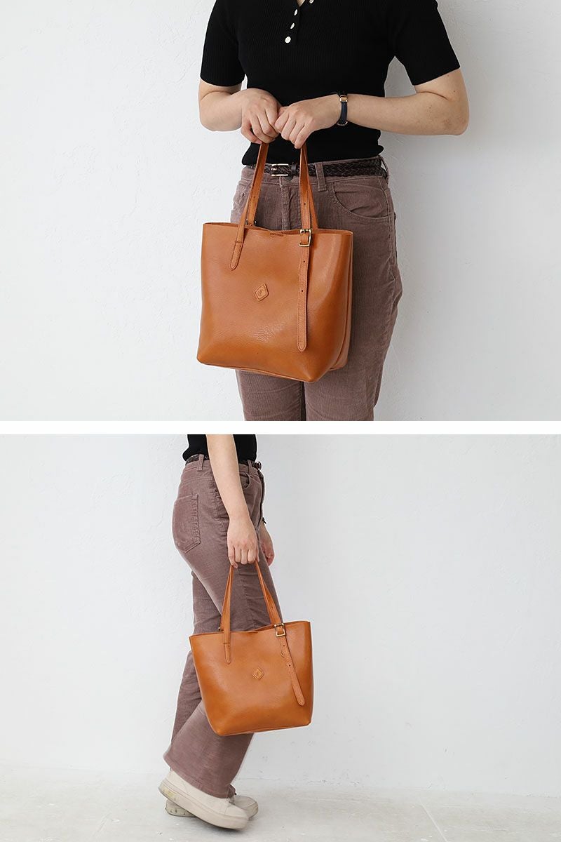 細身のハンドルで抜け感をプラス。艶やかなレザーのシンプルなトートバッグです。