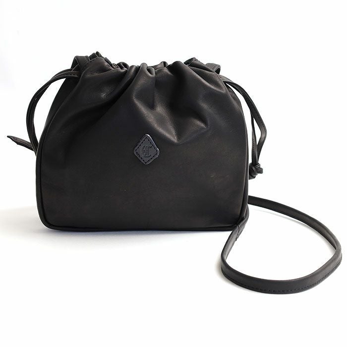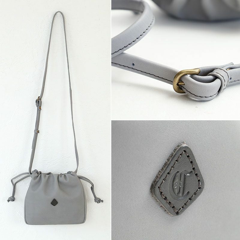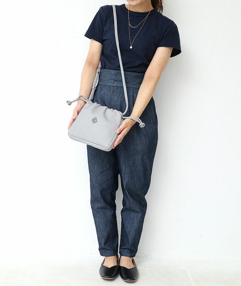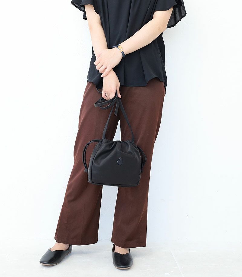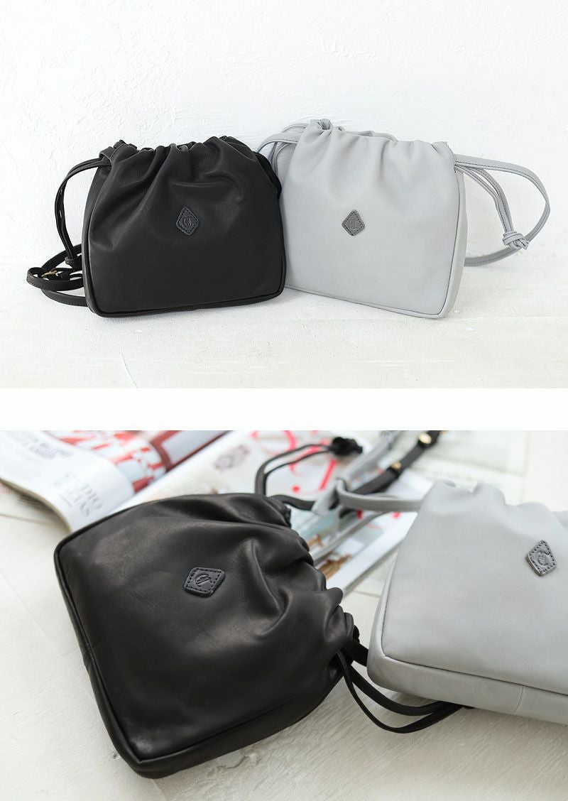 ほんのりと丸みを帯びた台形フォルムの巾着ショルダー。
