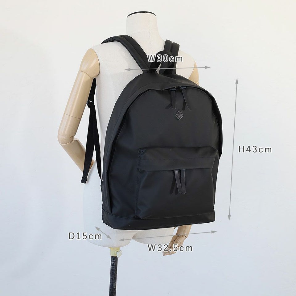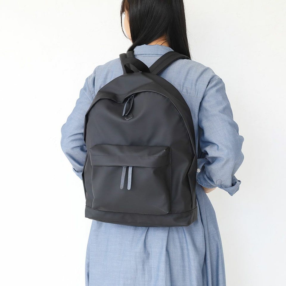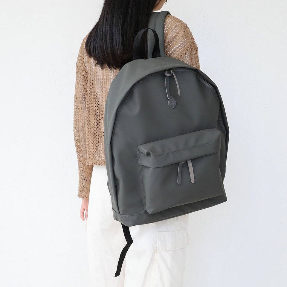 性別問わず持てるメンズライクなデザインで耐久性に優れたポリウレタン仕立てのリュックサック。