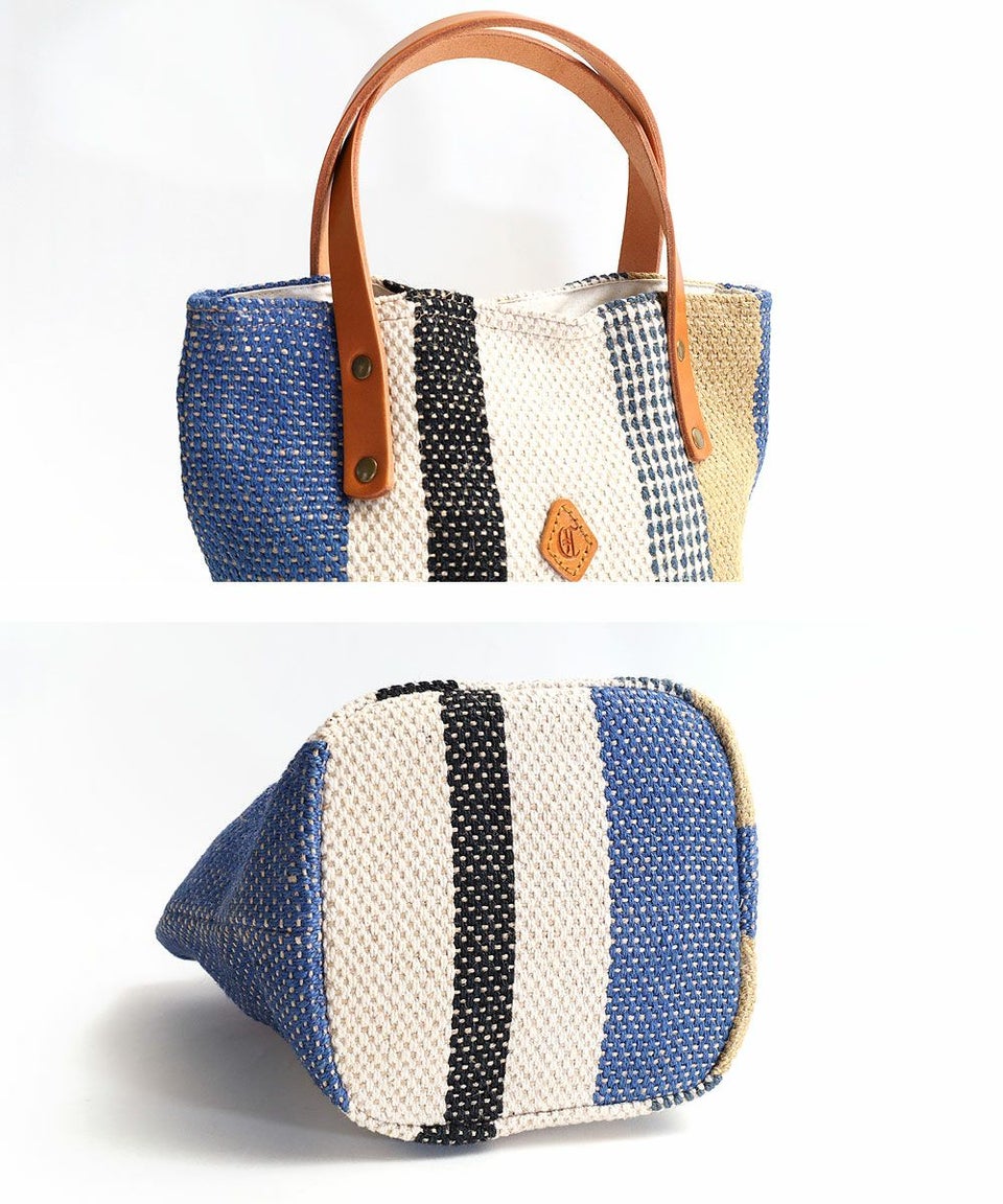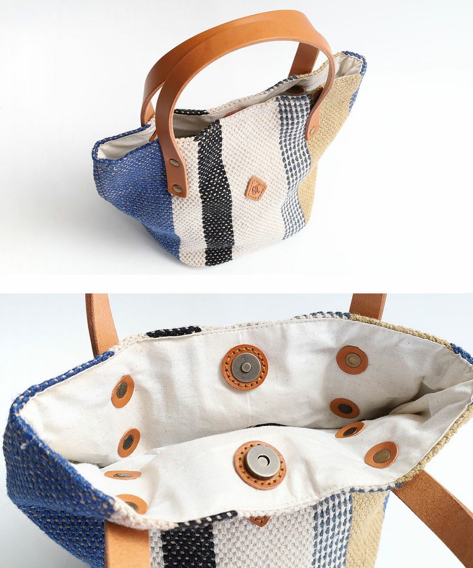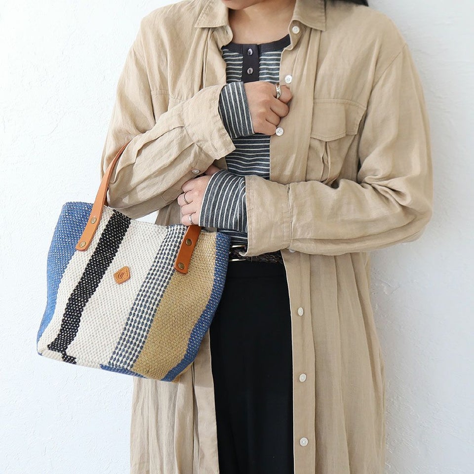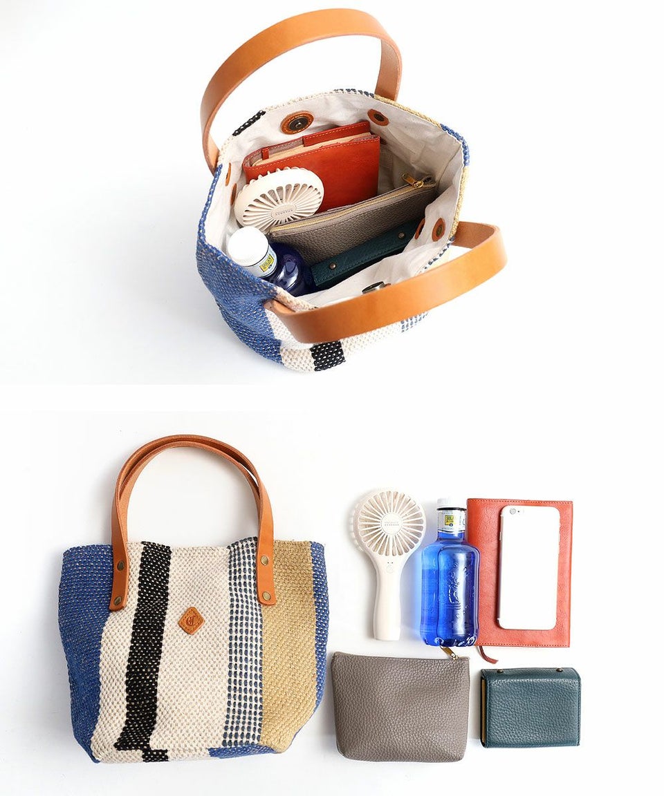 アクセントでキナリ色のコットンジュートも織り込んだ、ミニサイズ仕立てのカゴバッグです。