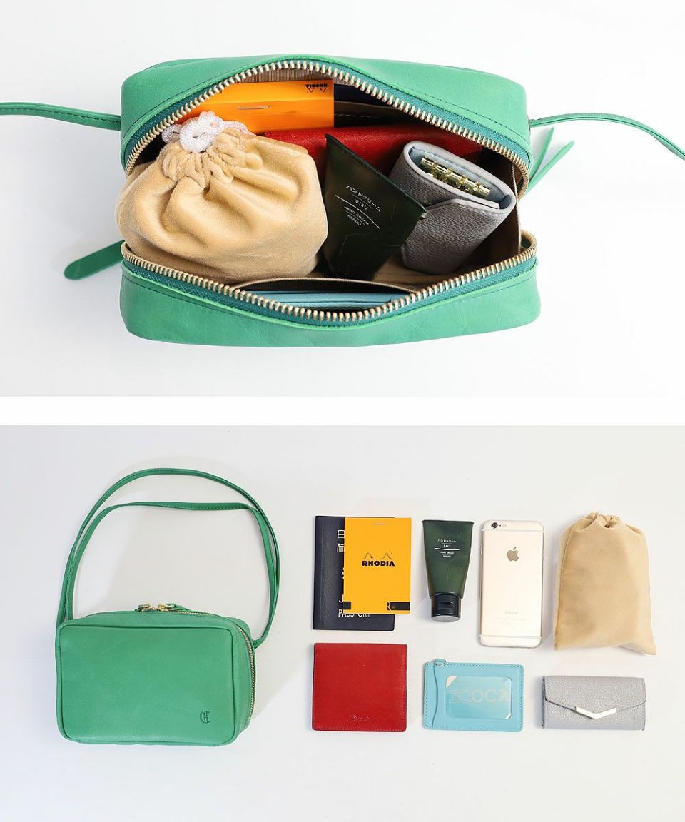 効率よく荷物が収まる箱型シルエットには、折り財布、ハンカチ、