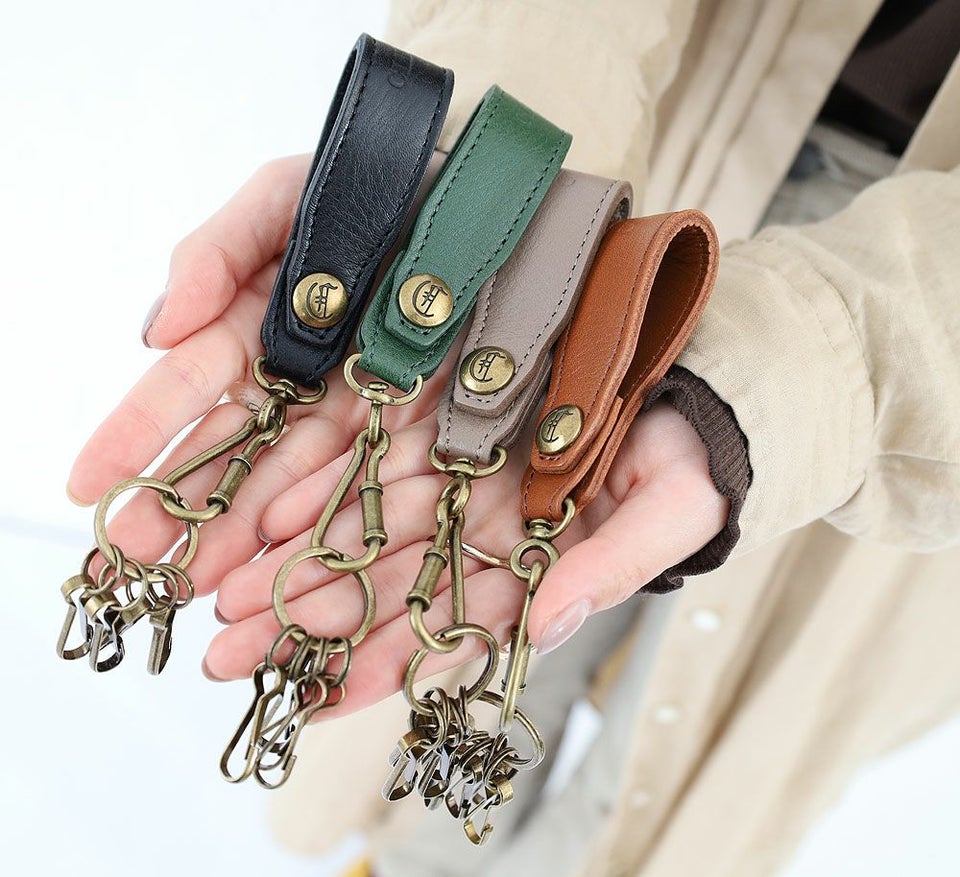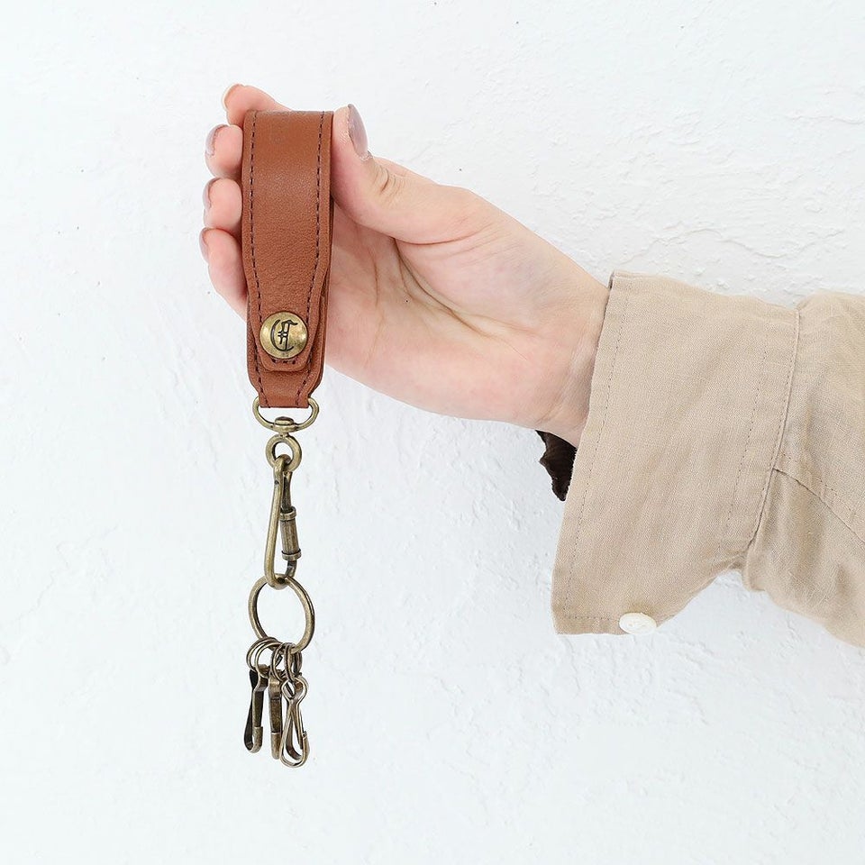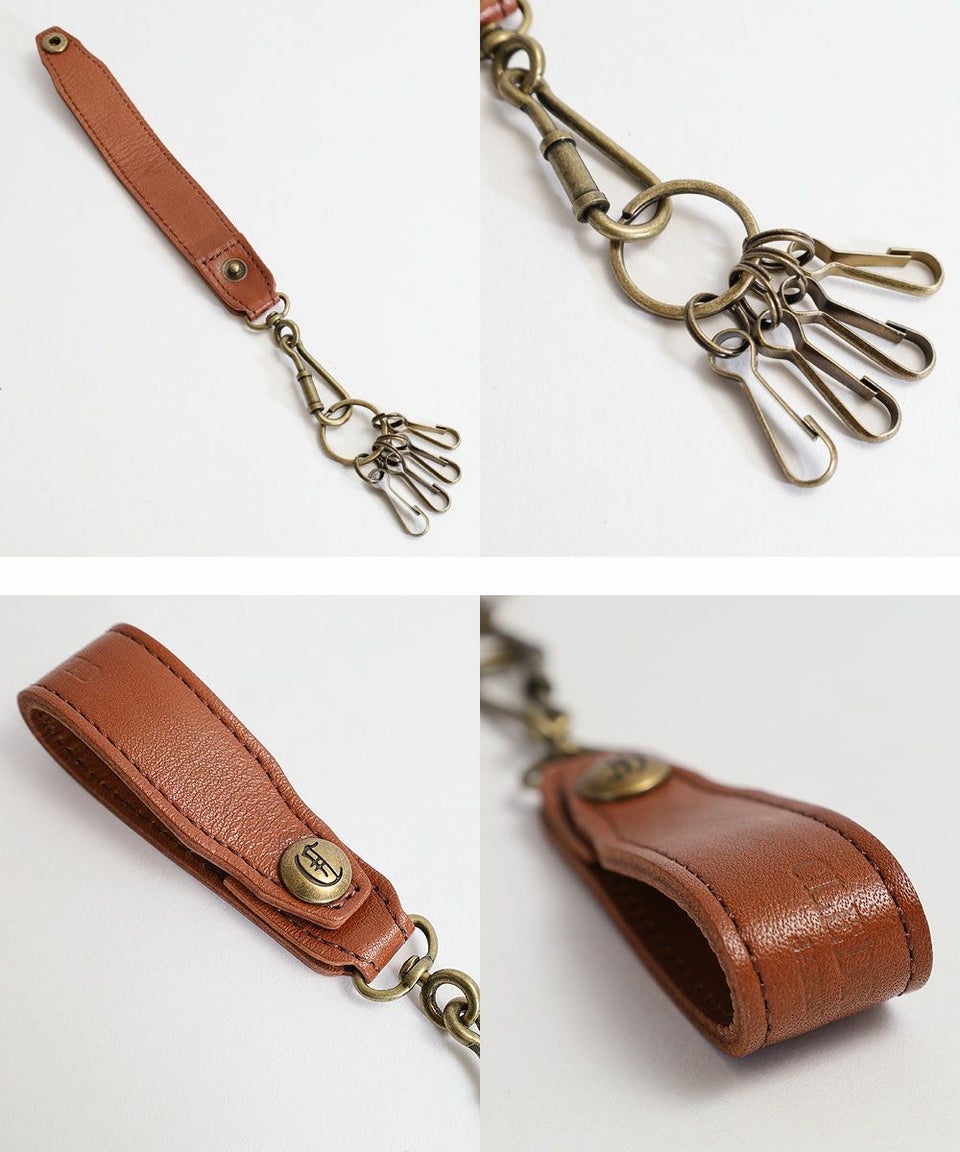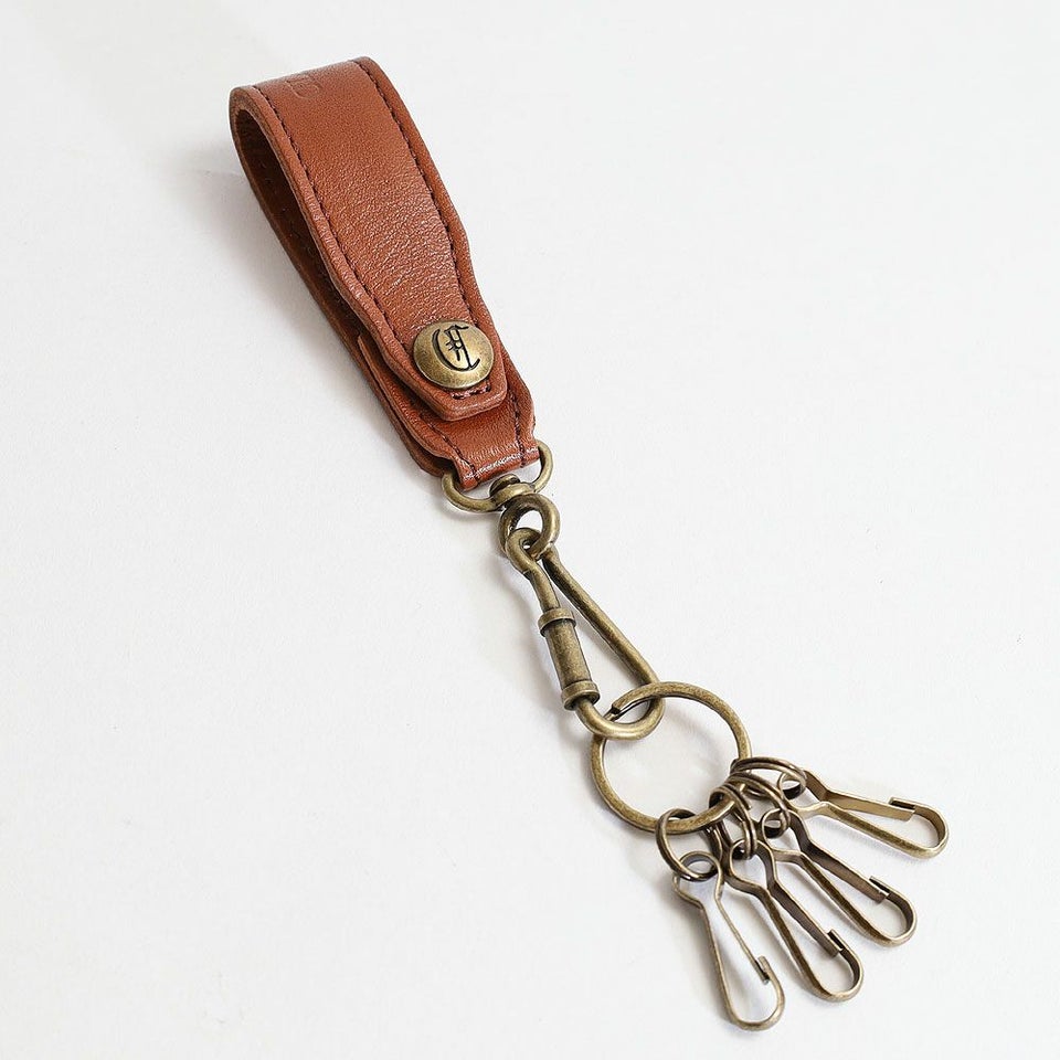 厚みのある上質なレザーにクレドランのブランドネームを刻印し、 アンティークなゴールド金具の4連キーフックを付けたキーストラップ。