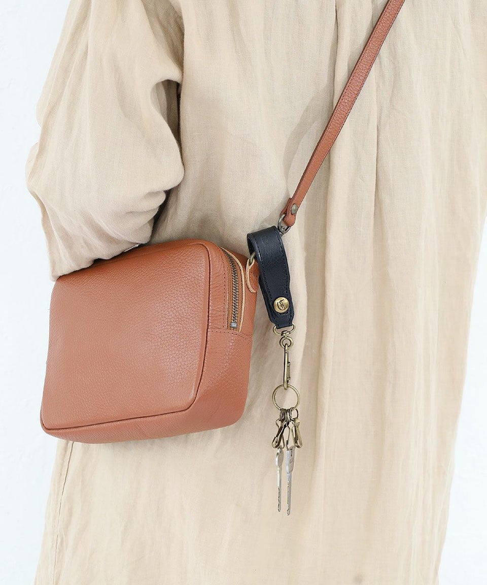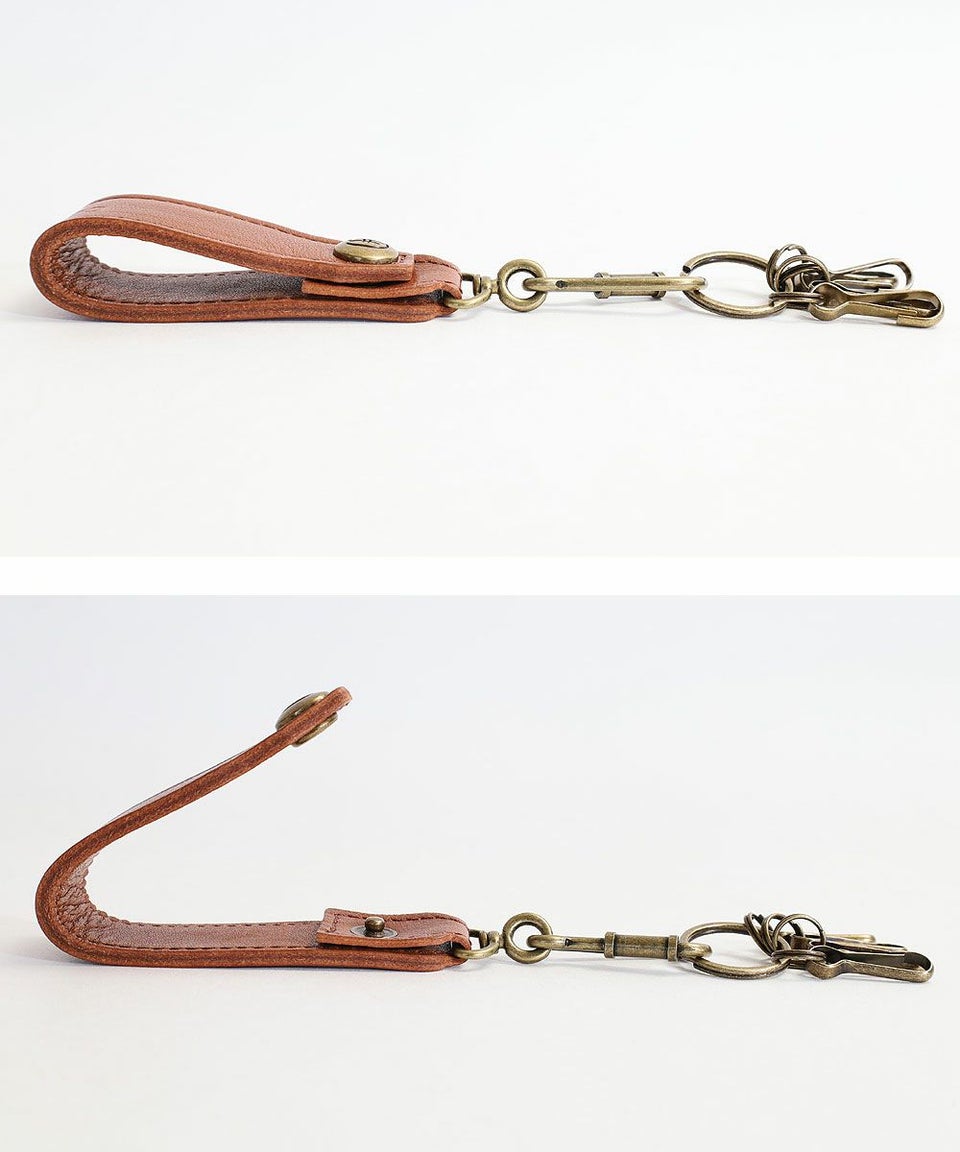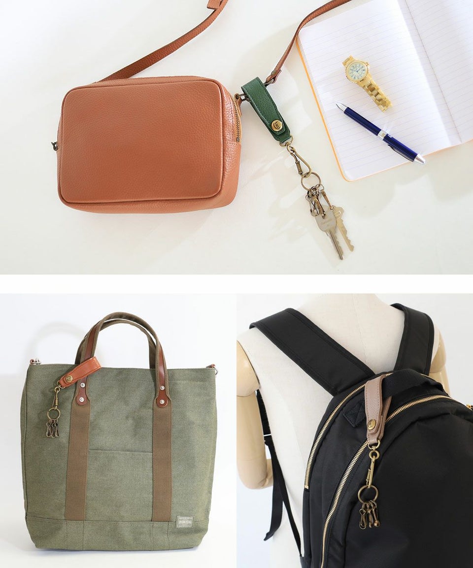 レザー部分はスナップボタンが付いており、 バッグにやベルトストラップなどに取り付けることが可能です。