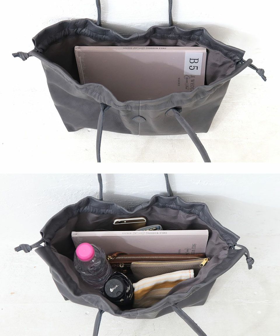 開口部を伸ばしてスタンダードなレザートートとして、 キュッと結べば口元がクシュクシュとしたギャザーになりかわいらしく持つことができます。