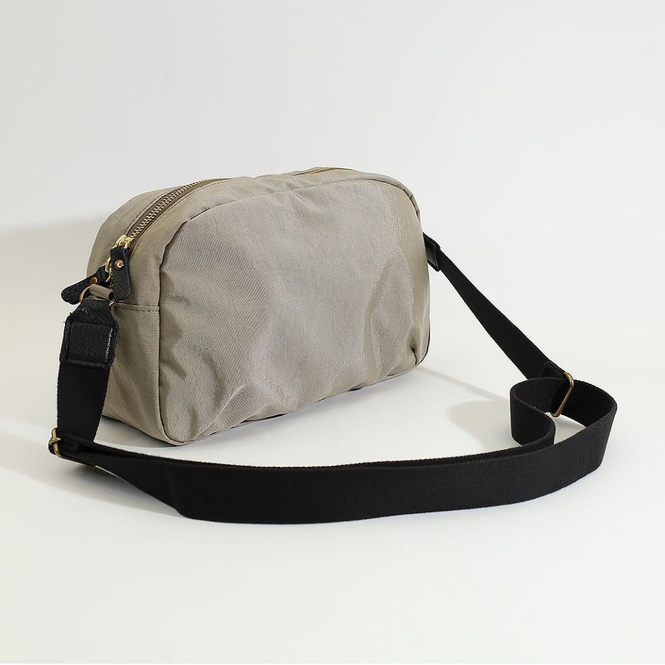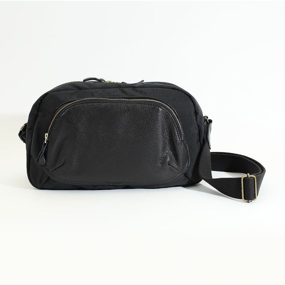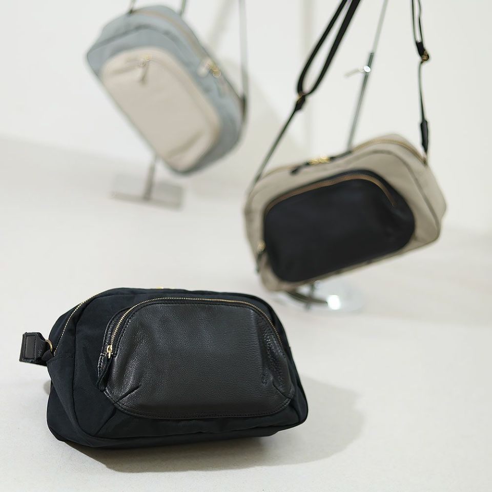軽くて丈夫なナイロンに、さりげないレザー使いがアクセント。カジュアルすぎず、上品な大人の装いに自然となじみます。