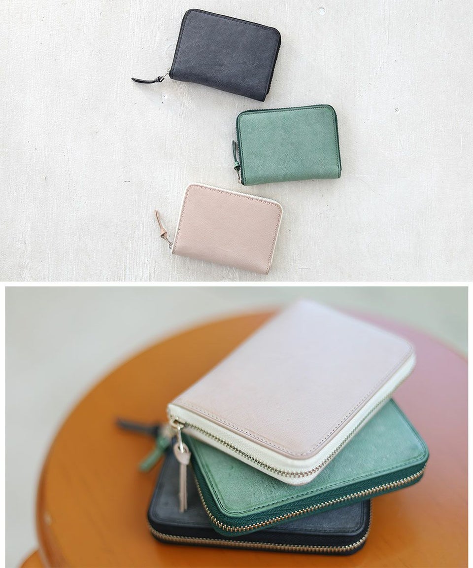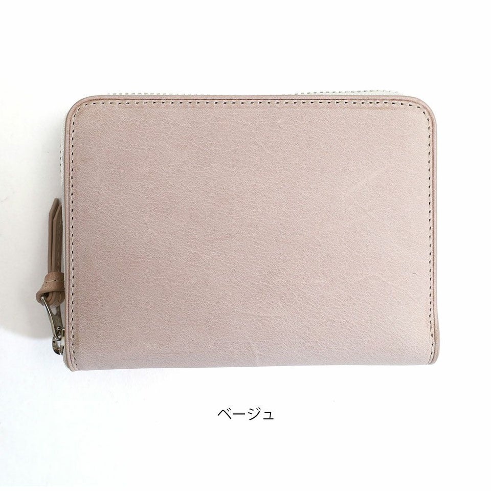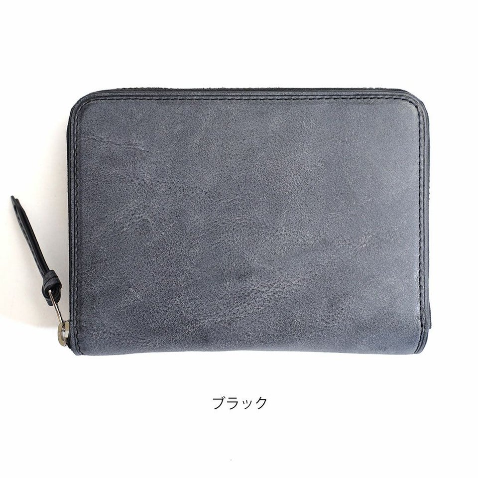 長財布と二つ折りの中間にあたる大きさのラウンドファスナータイプのミドルウォレットです。