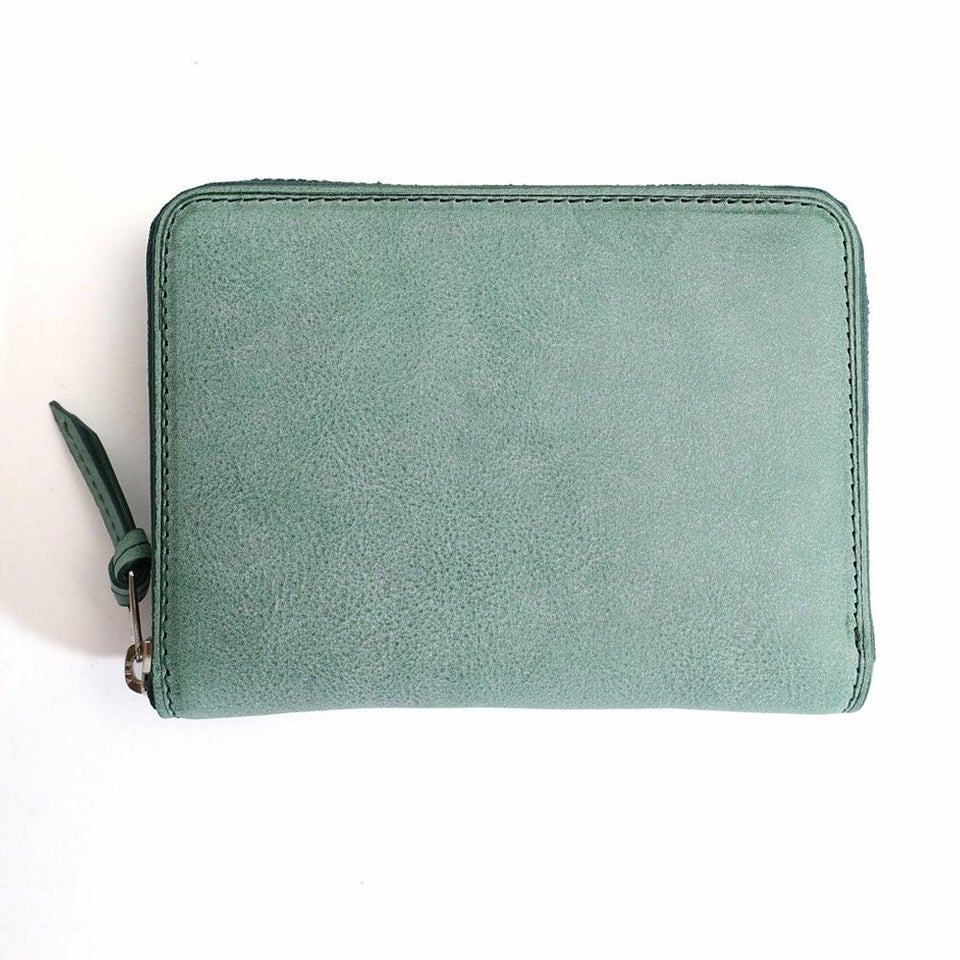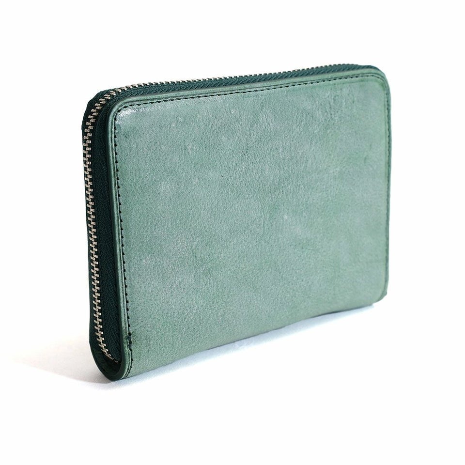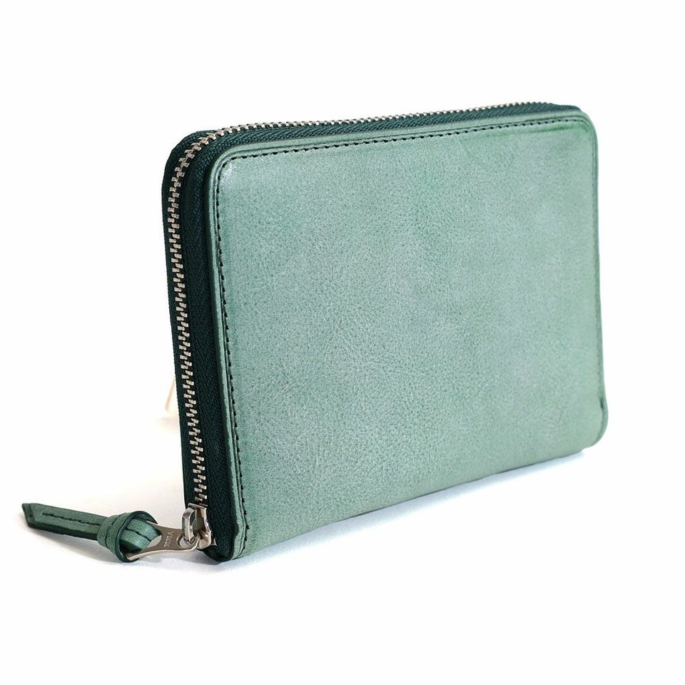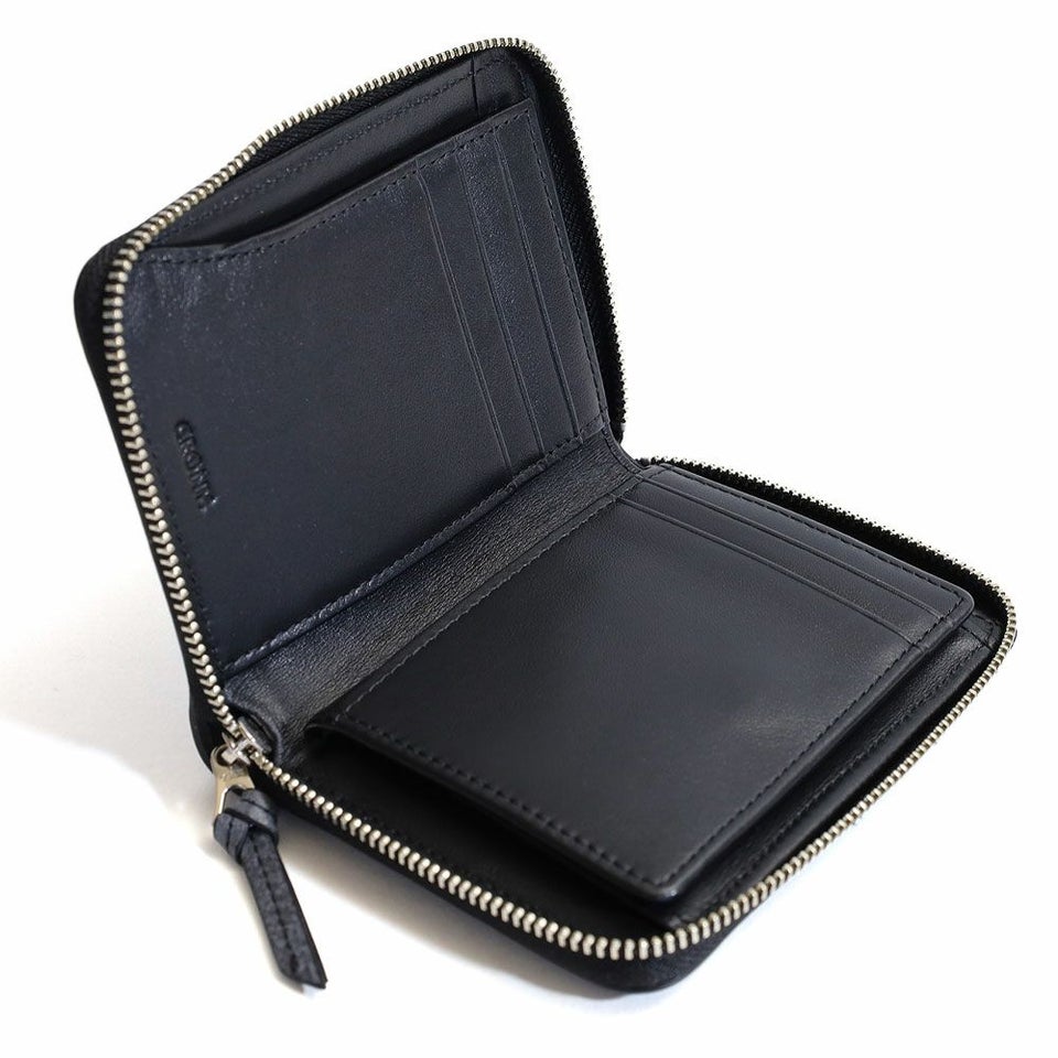 長財布と二つ折りの中間にあたる大きさのラウンドファスナータイプのミドルウォレットです。