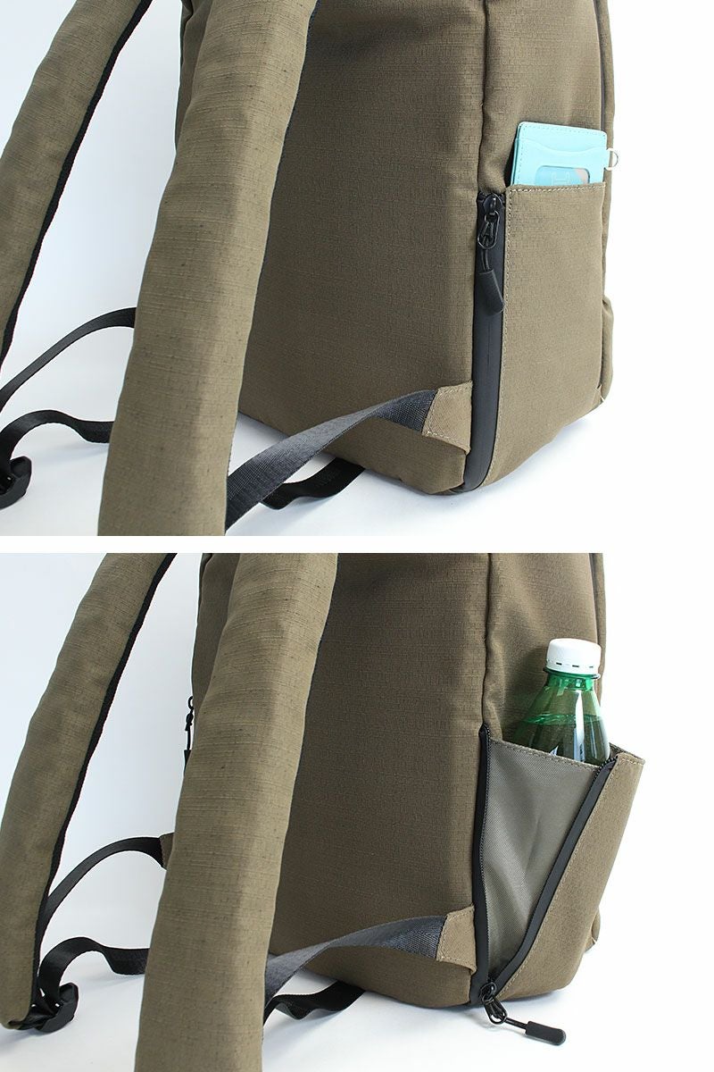 外側にはファスナー付きのポケットを搭載しており、折り畳み傘からペットボトルや少し大きいボトルなども収納することができます。