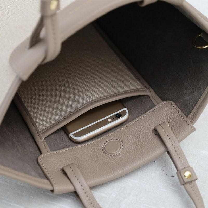 コットン素材と牛革をのコンビが洗練された印象を与えてくれるトートバッグです。