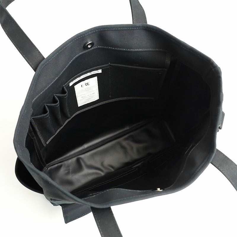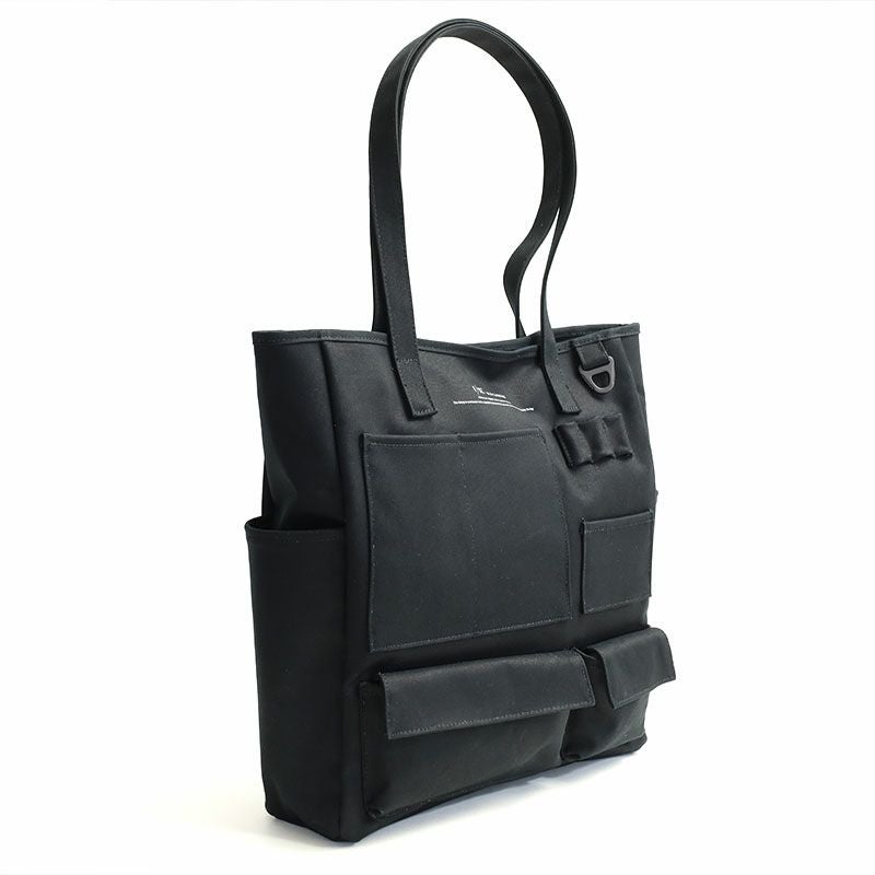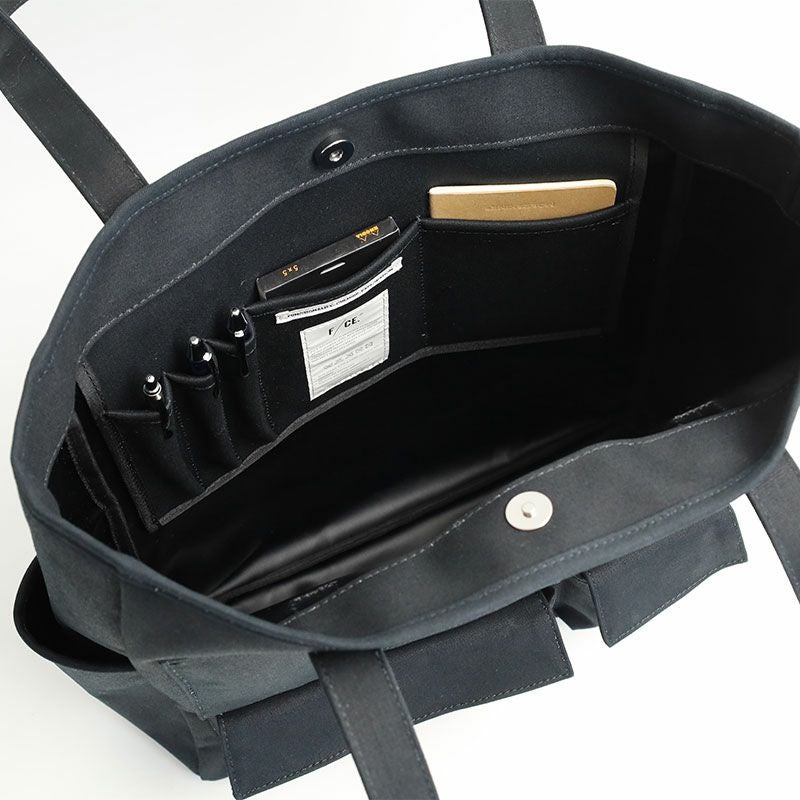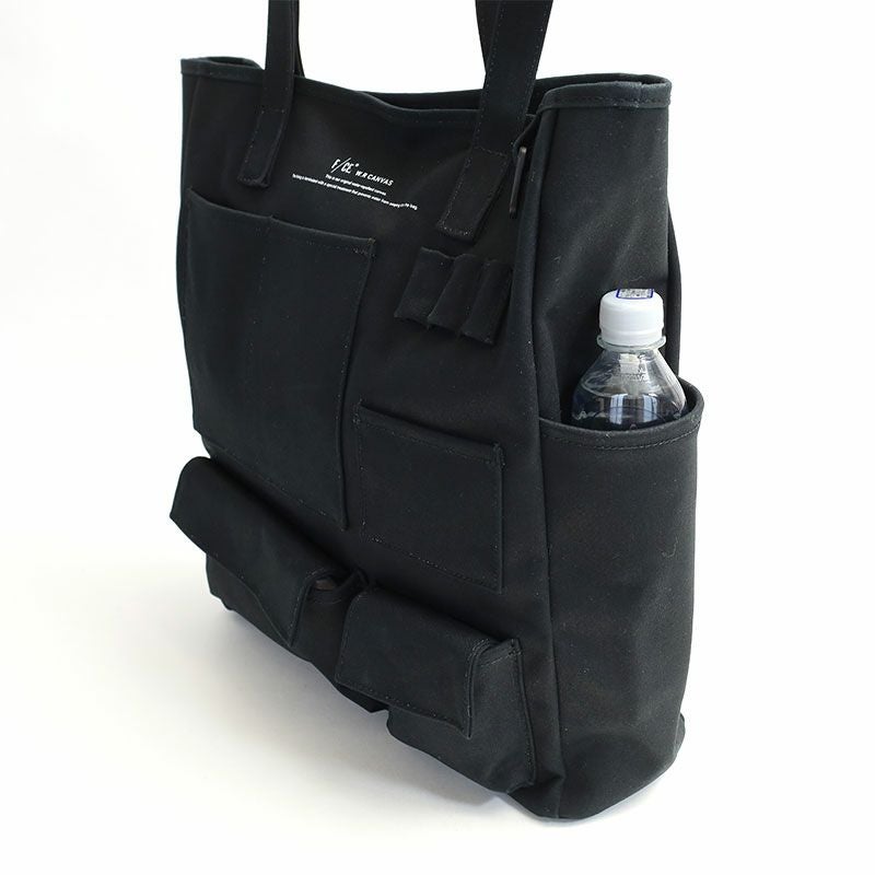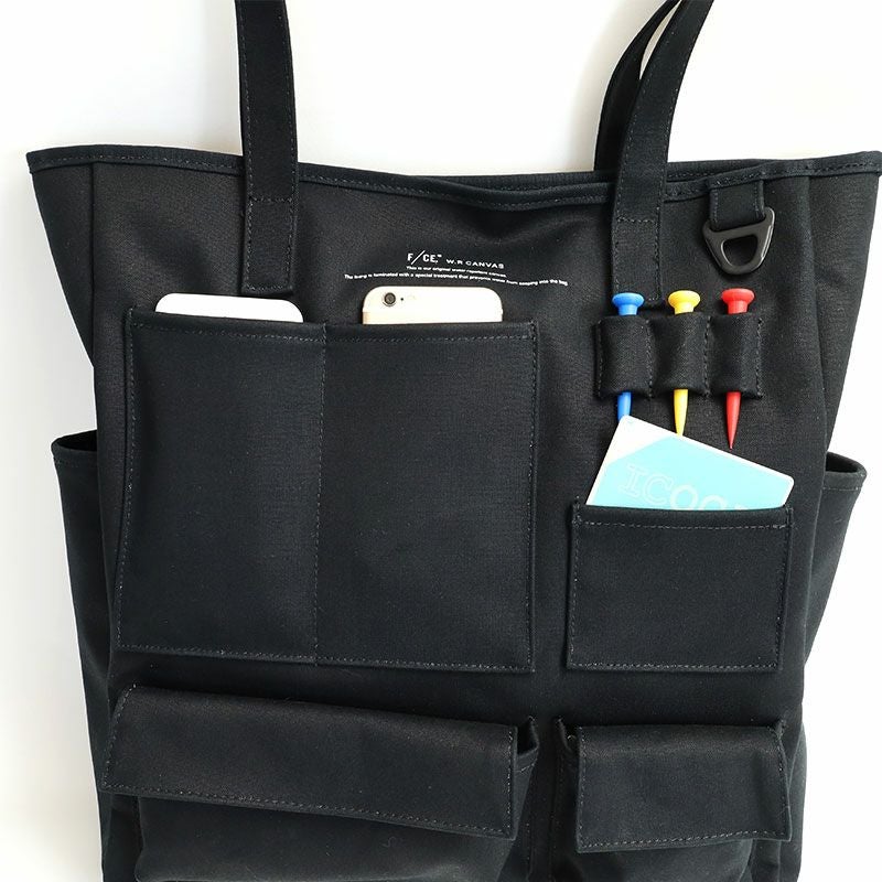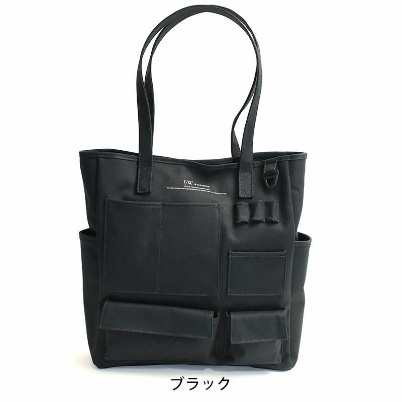 コットン100%の11号帆布の裏に、PVC加工を施し撥水機能をもたらしたF/CE.の撥水キャンバス【W.R CANVAS】を使用した、フロントにスマートフォンやペン入れなど、様々な形のポケットが施された縦型のトートバッグ。