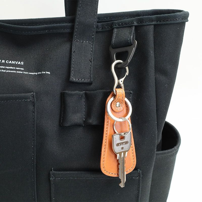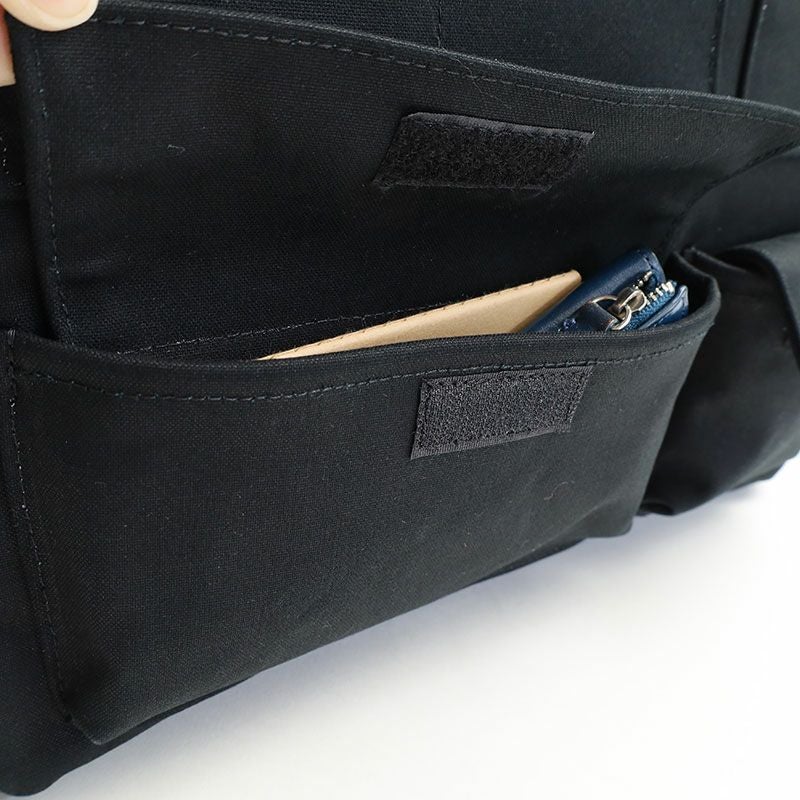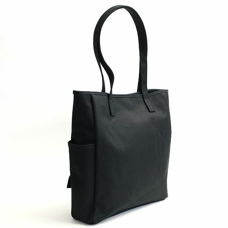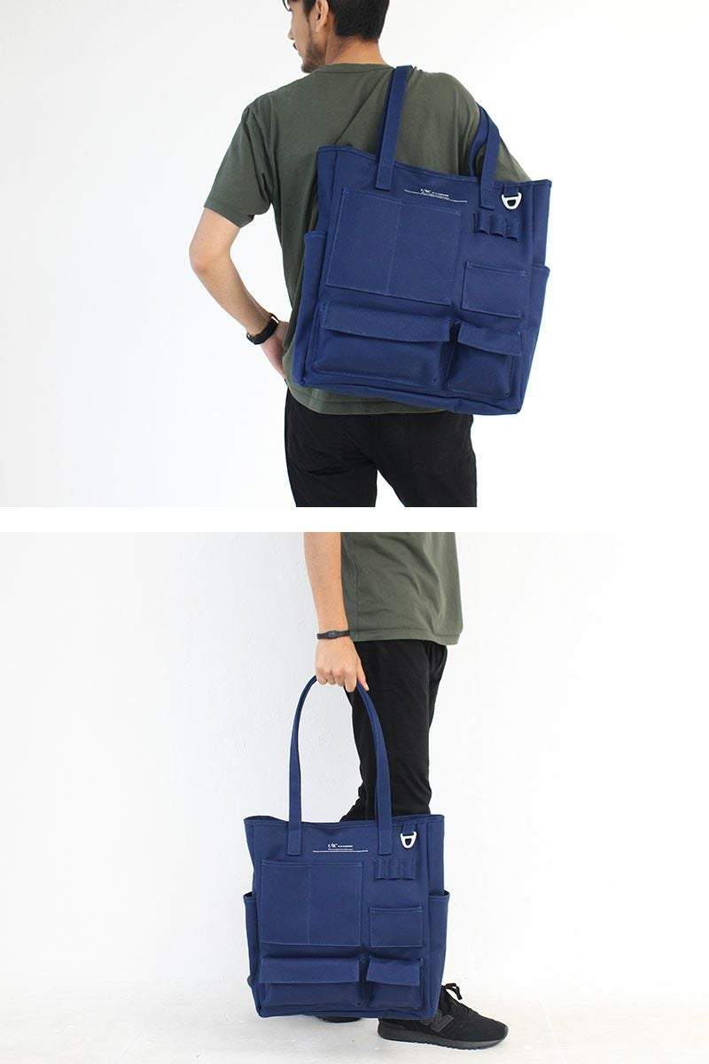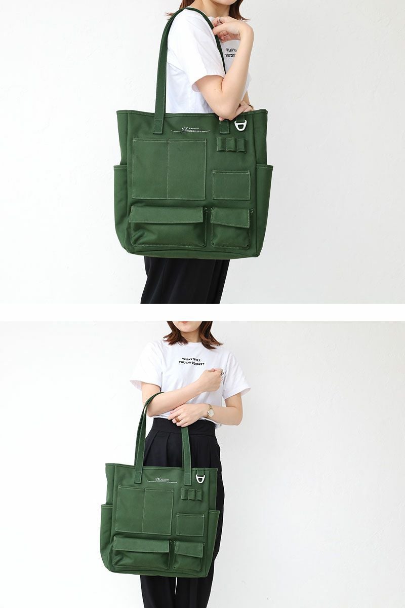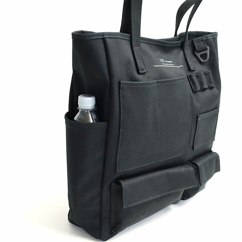 コットン100%の11号帆布の裏に、PVC加工を施し撥水機能をもたらしたF/CE.の撥水キャンバス【W.R CANVAS】を使用した、フロントにスマートフォンやペン入れなど、様々な形のポケットが施された縦型のトートバッグ。
