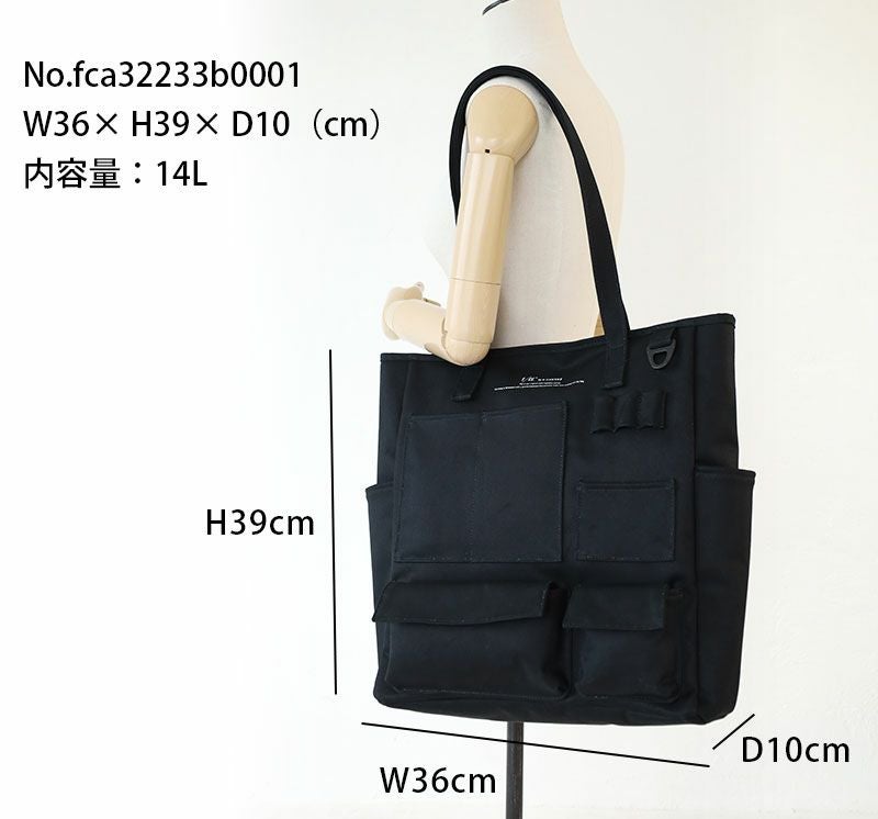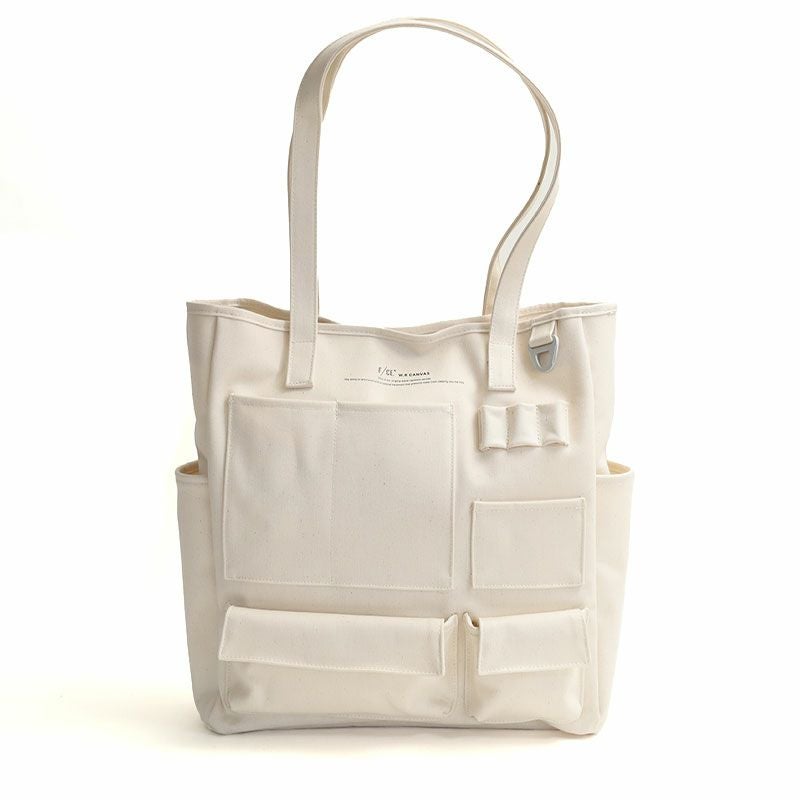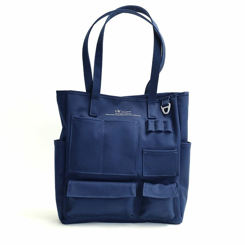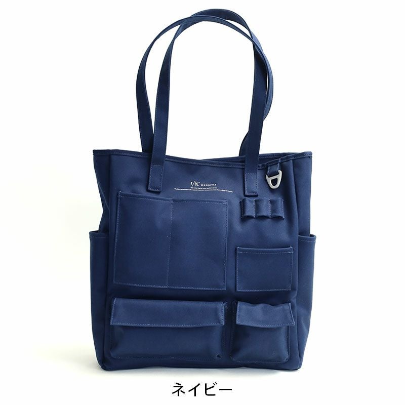 フロントにスマートフォンやペン入れなど、様々な形のポケットが施された縦型のトートバッグ