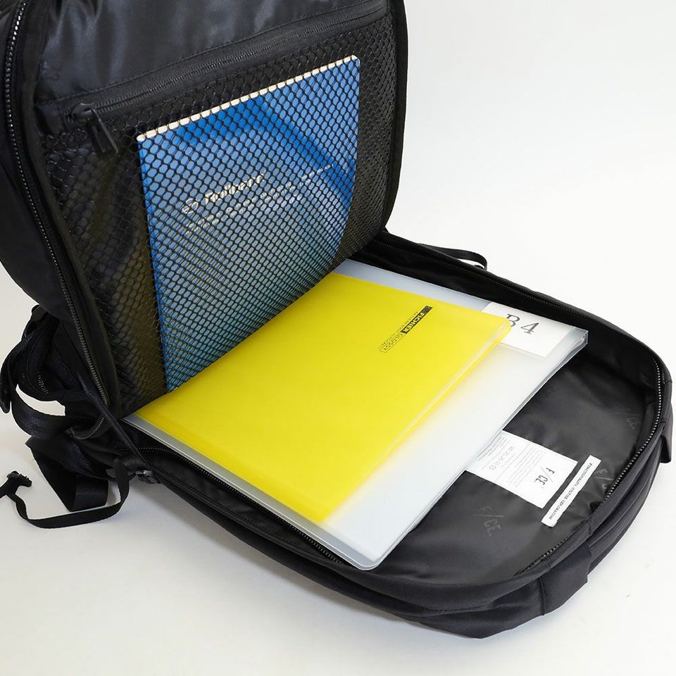フロントにはマルチガジェットポケットを内装に装備しており、ペンやノート、スマートフォンなど様々なサイズの小物の収納に対応した幅広いポケットに、キーフックまでが備わっています。