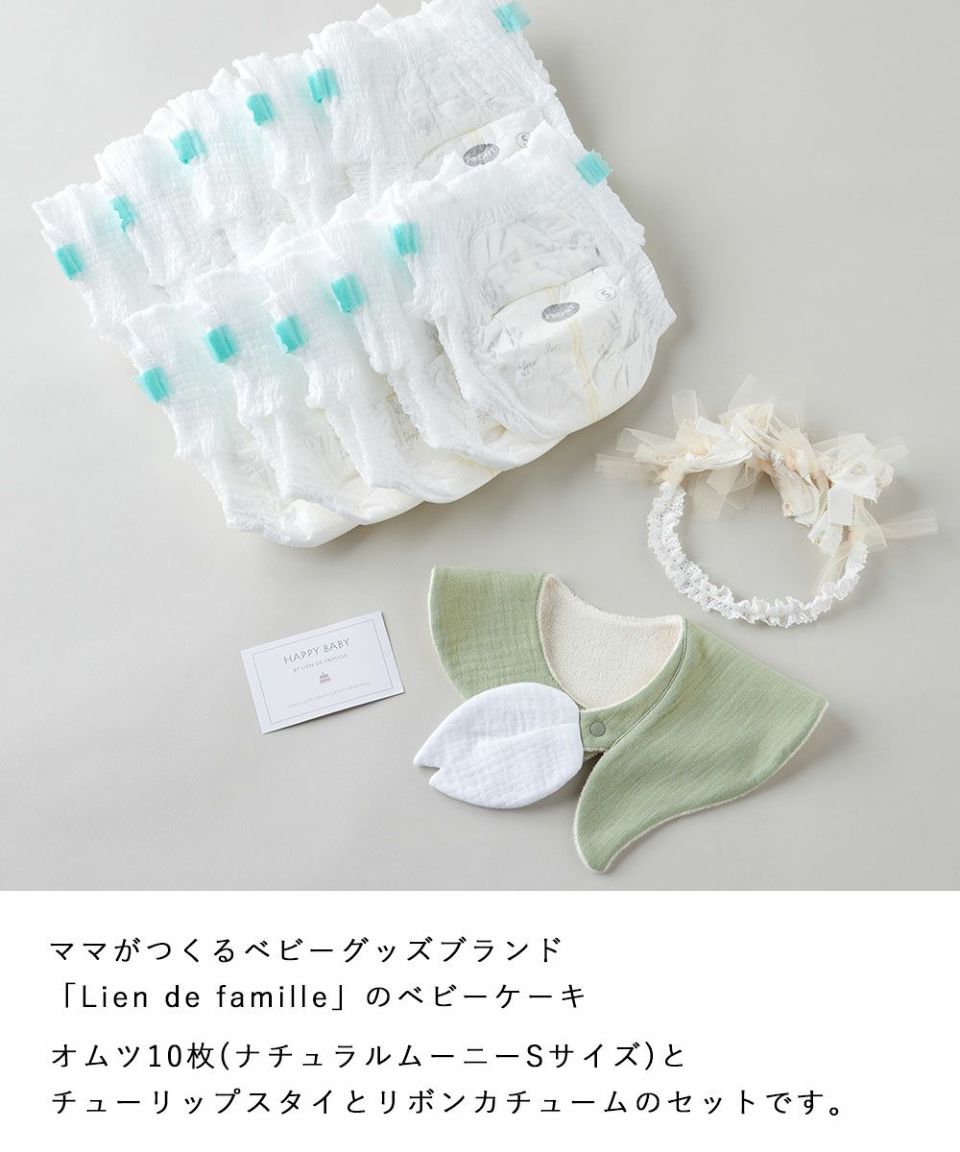 ラッピング無料 ナチュラルムーニーSサイズ10枚とチューリップスタイとリボンカチュームのベビーケーキ 出産祝いやベビーシャワーにおすすめ