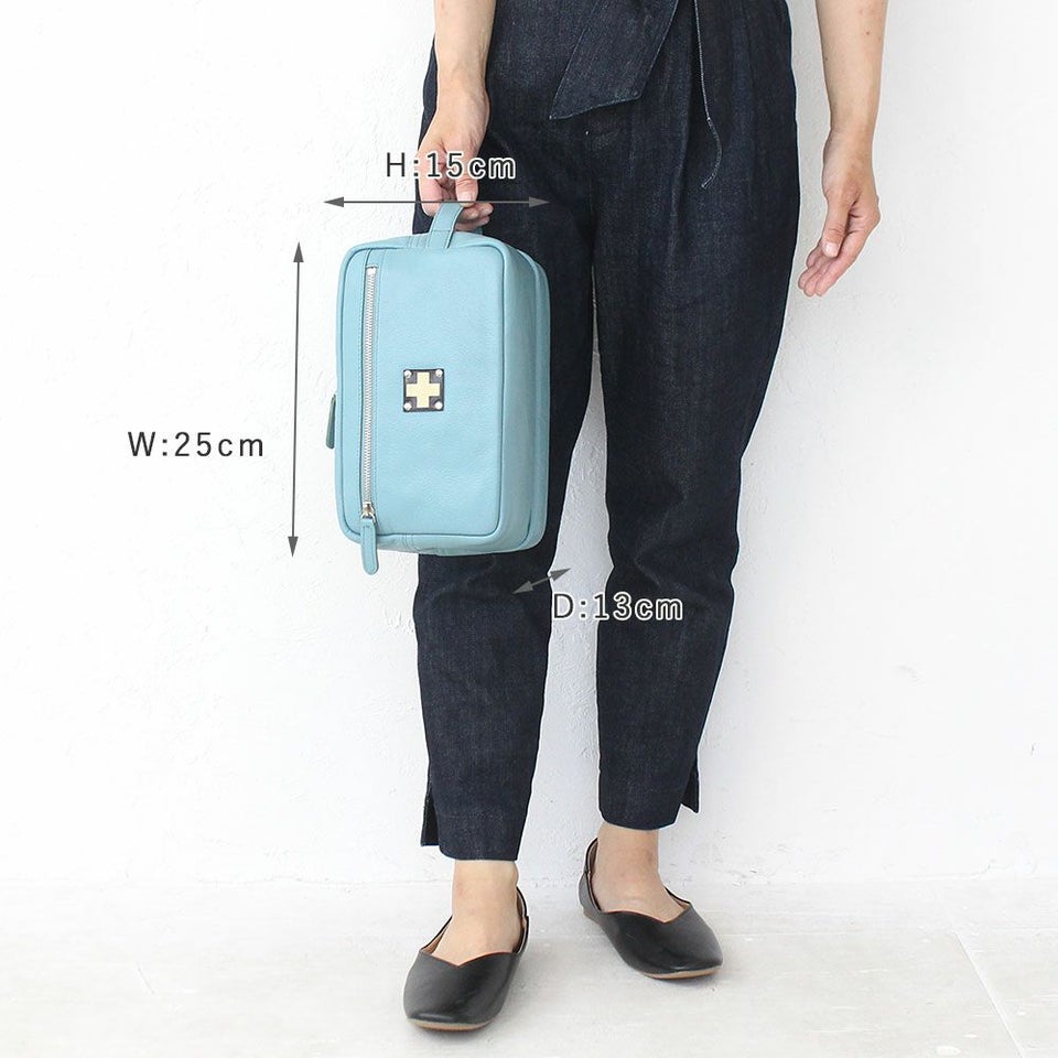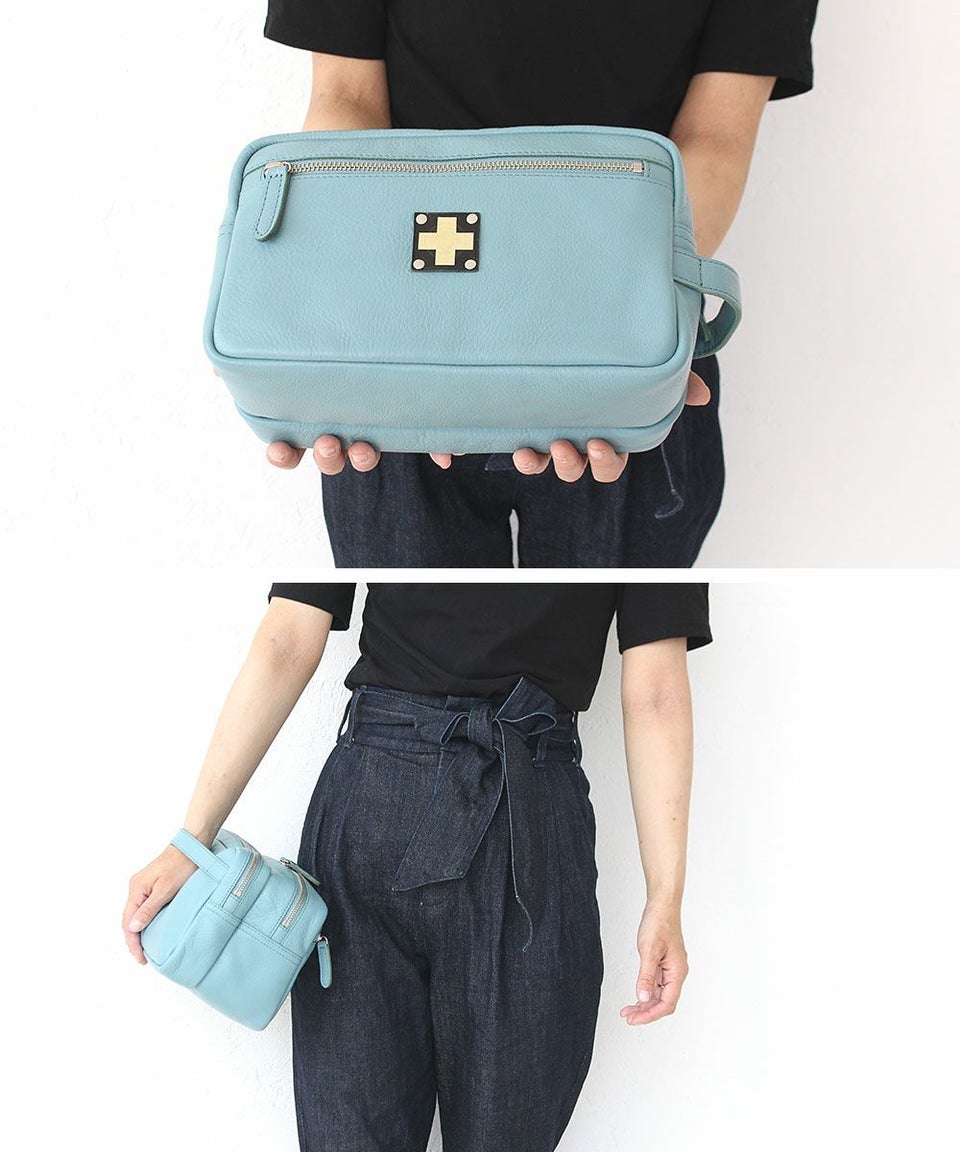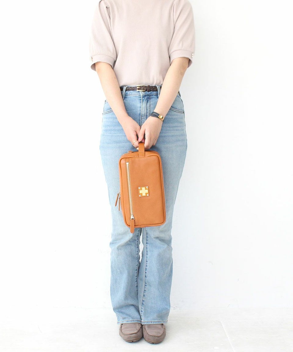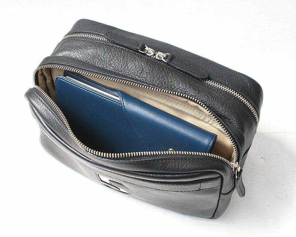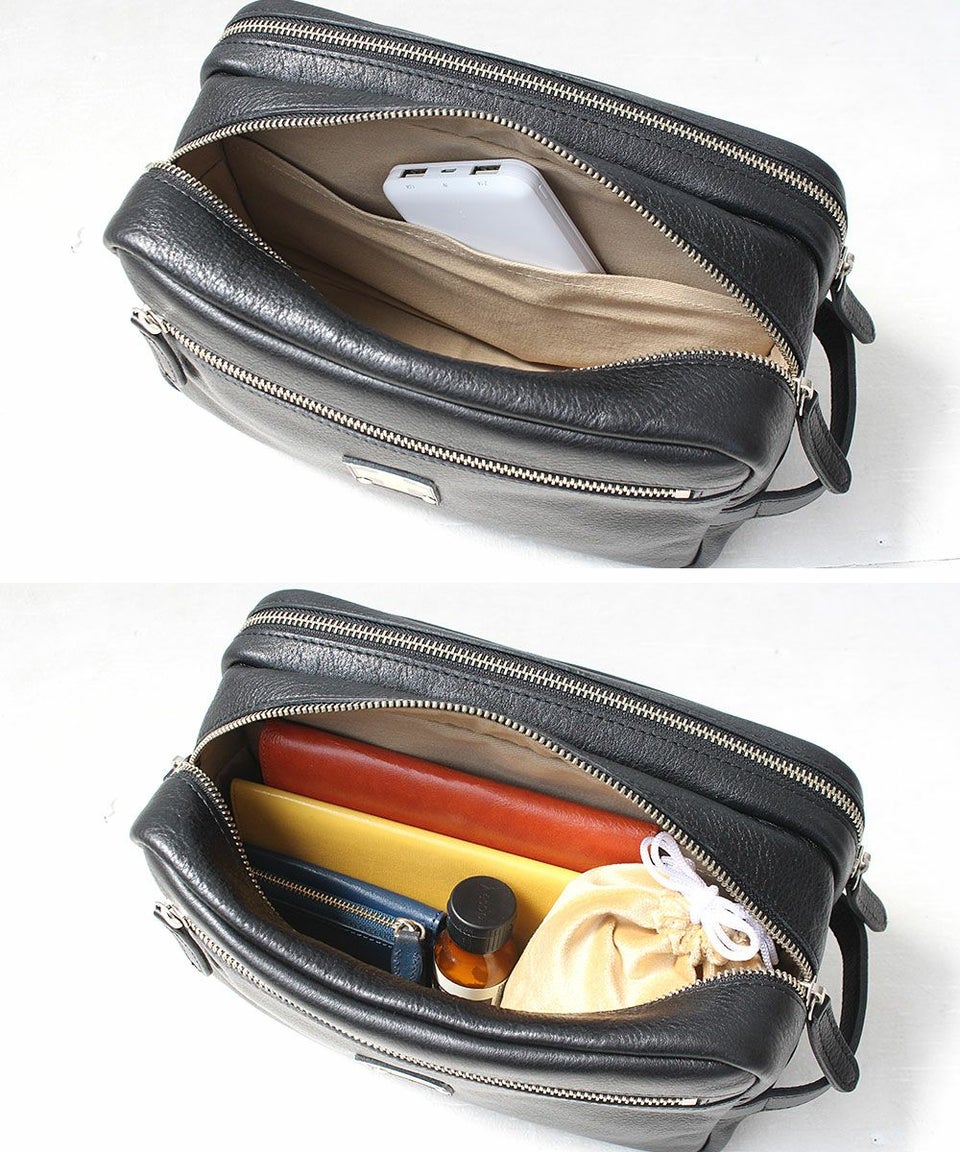 財布、スマホ、メガネ、パスポート、充電器など身の回りのものをすっきりと収納できるオールレザーポーチ。