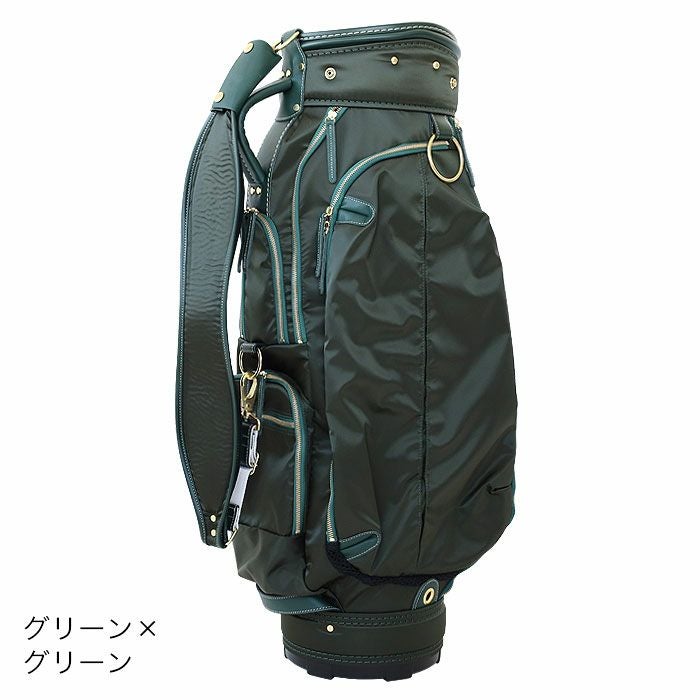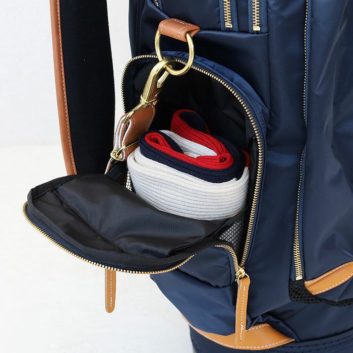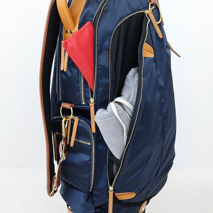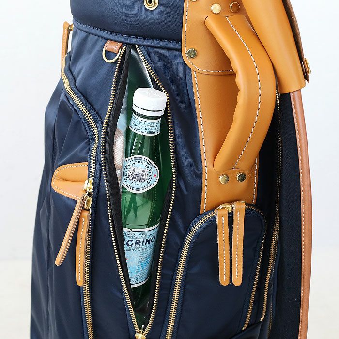 鮮やかな色合い、上品な光沢、きめ細かく丈夫な素材は、撥水性にも優れています。各部に上質牛革を用い、しっかりした縫製で、使いやすさと共に耐久性も抜群のキャディバッグ。軽量のため女性やシニアの方にもお勧めです。