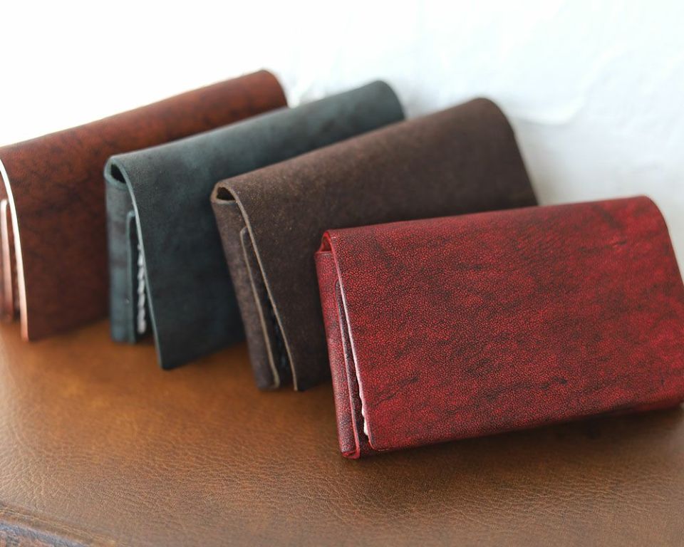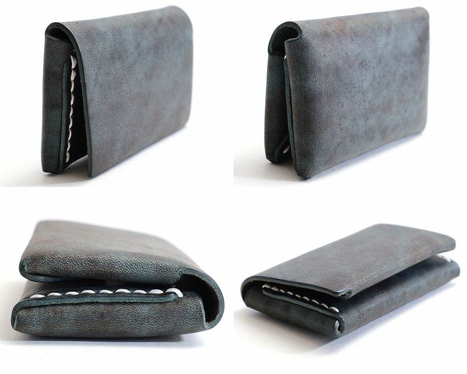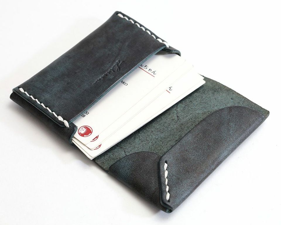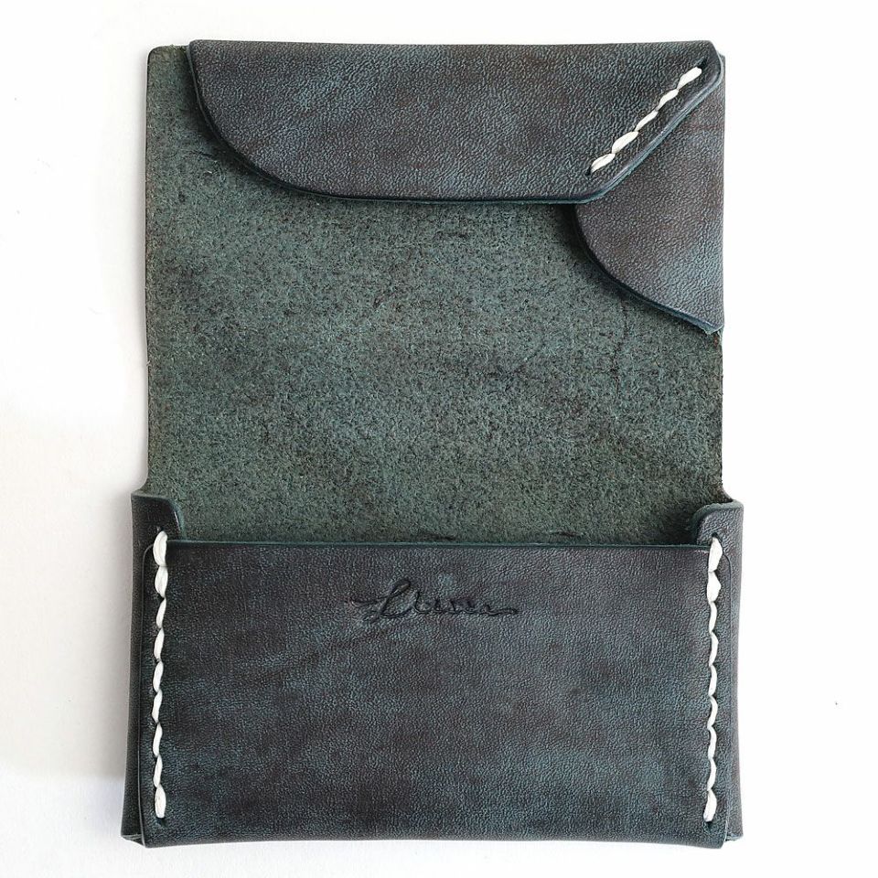 一枚革を折り紙の様に折りたたんで手縫いした名刺入れ。