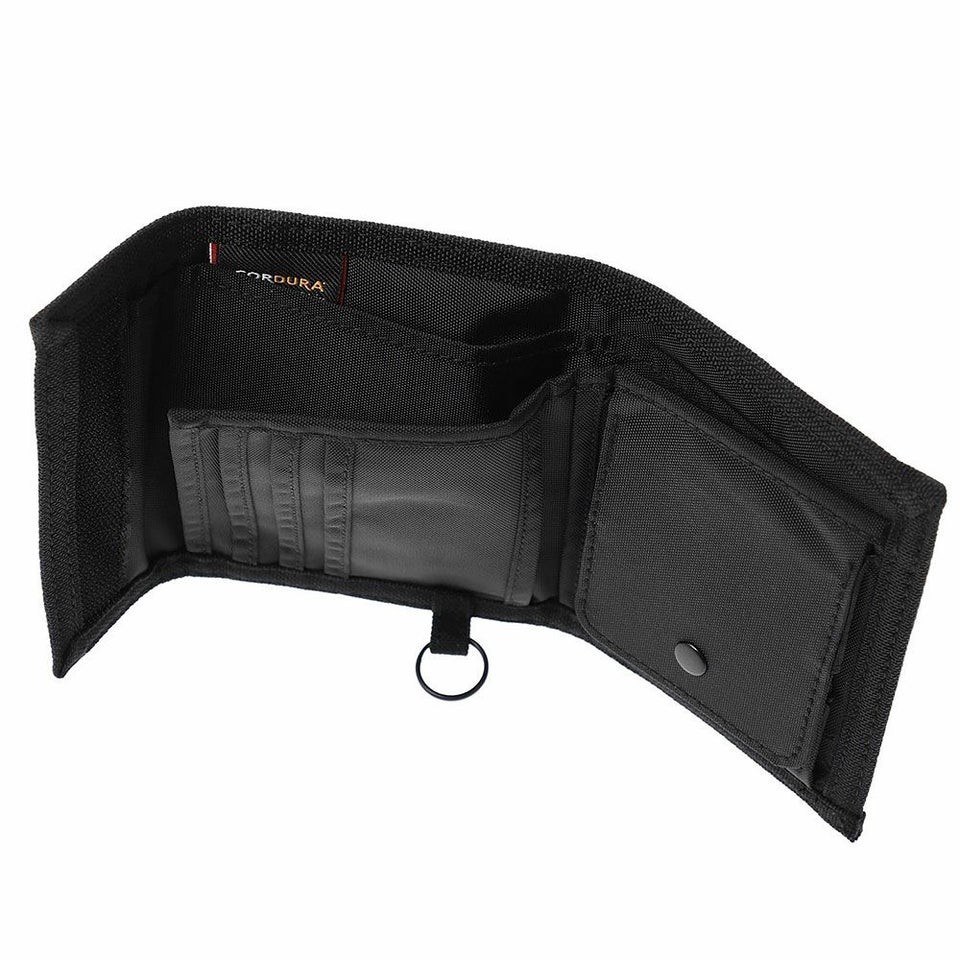 素材には耐久性に優れたコーデュラナイロンを採用し、ハードな使用にも対応します。ベルクロ開閉で中身をしっかり守り、ウォレットチェーンリング付きのためアクティブなシーンでも安心して携帯できます。