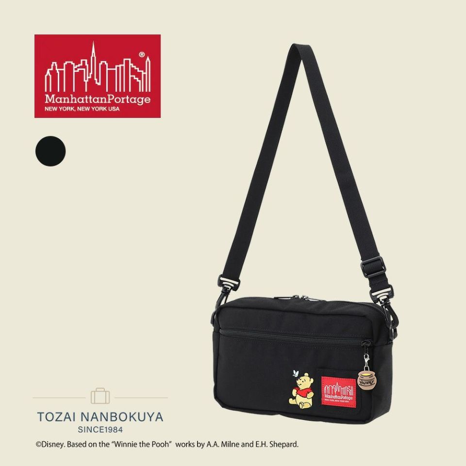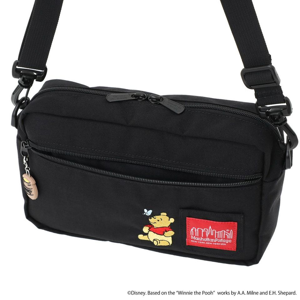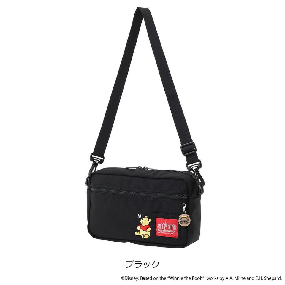 蝶々と遊ぶかわいらしい「プーさん」のアートワークが目を引くショルダーバッグ。