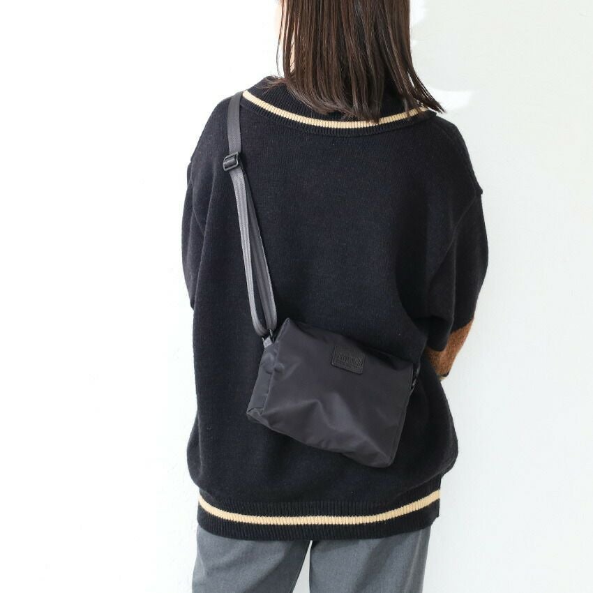 生地の特徴を活かしたシンプルなスクエア型のショルダーバッグは、身の回りの小物をスマートに収納するサイズ感となり、トラベル時のサブバックや日常のお出掛け時に活躍します。
