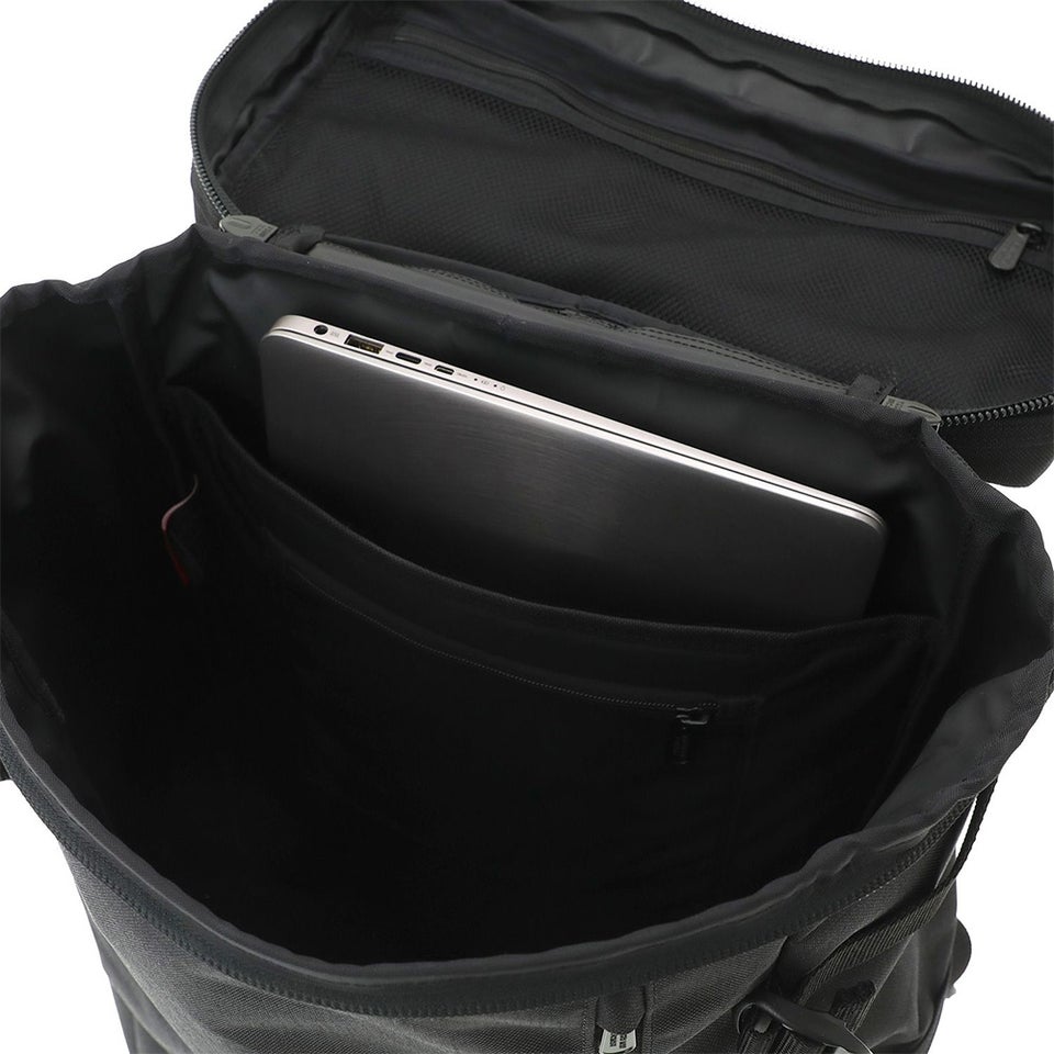 1000デニールのコーデュラナイロンを使用し、ハードな使用にも耐える高い耐久性を実現。さらにライニングにはマットな質感のPVC加工を施したナイロン素材を採用し、防水性にも配慮しています。防水機能を備えた製品に付けられるイエローラベルも配置し、雨の日でも安心して使えるタフなバックパックです。