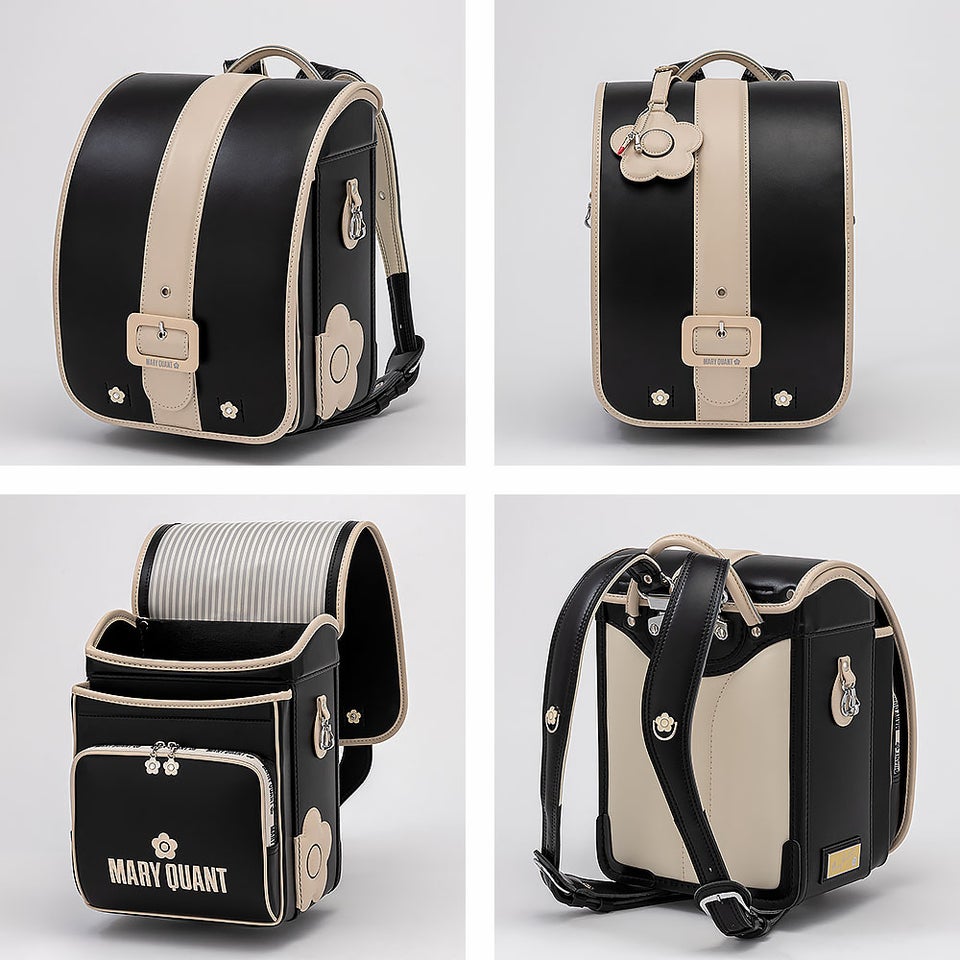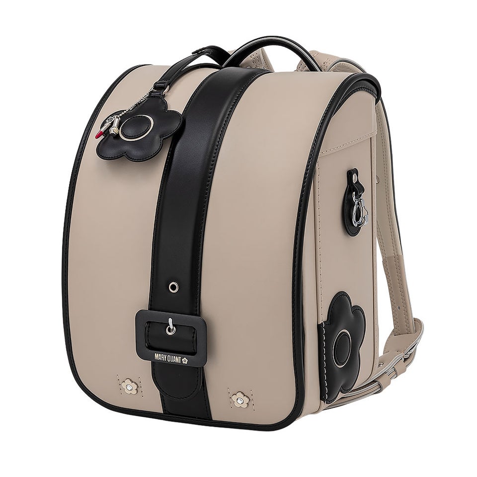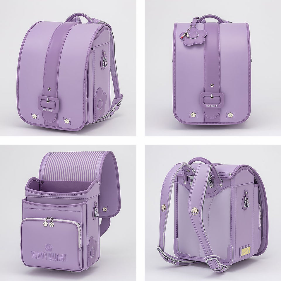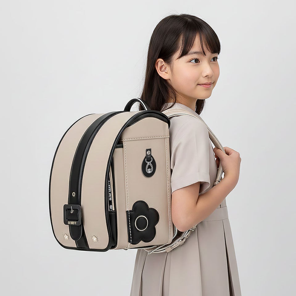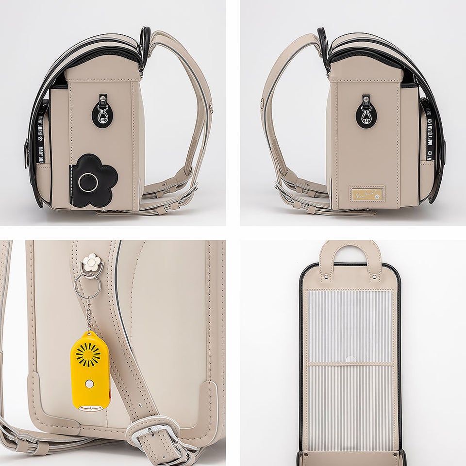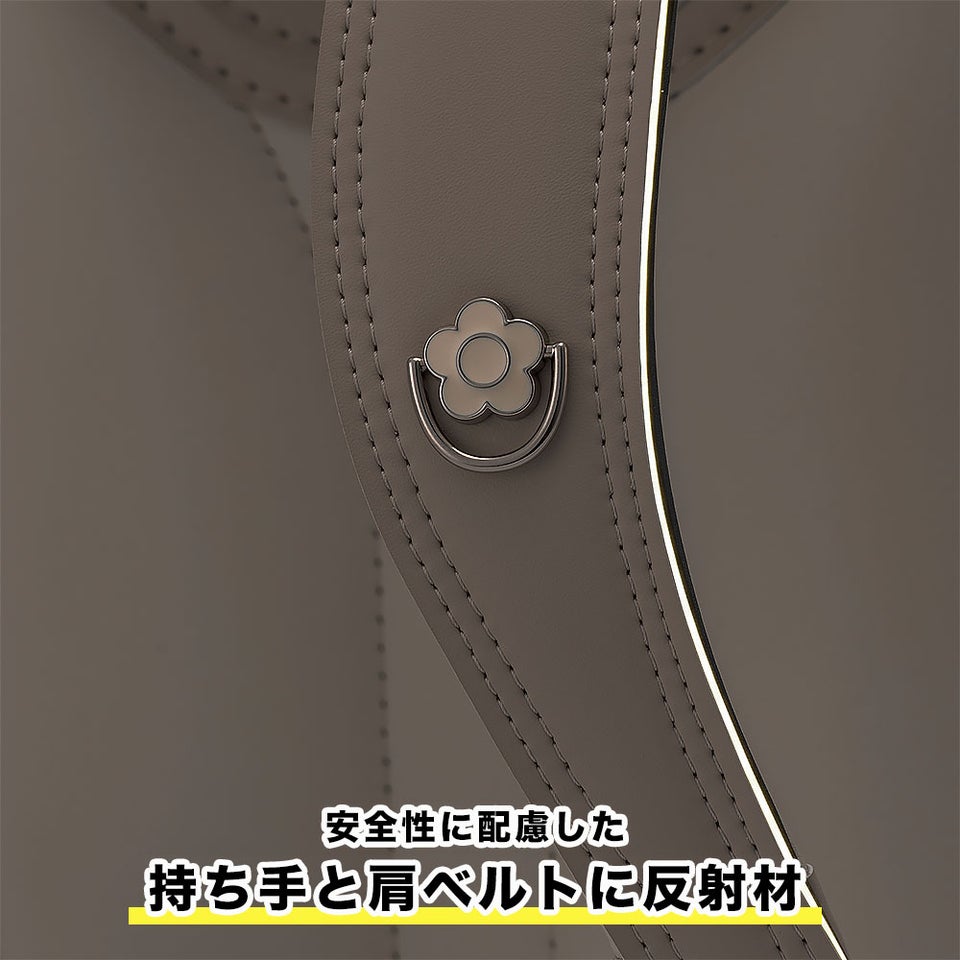 持ち手と肩ベルトに反射材を配置し、夕方や雨天など視界の悪い環境でも車のライトに反射して存在を知らせます。肩ベルトのDカンは防犯ブザーを取り付けやすく、素早く手が届く位置に設計。毎日の通学を安全面からもしっかり支えます。