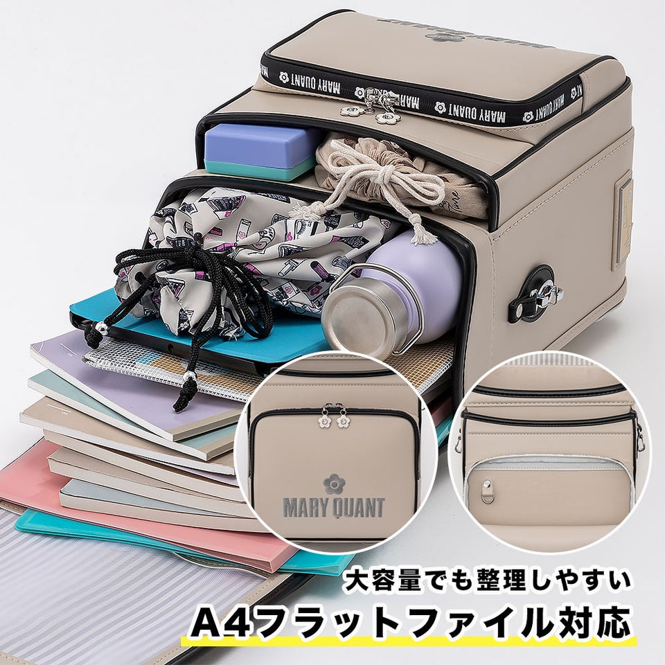 A4フラットファイル対応の広い収納に加え、12.5cmの大マチを備えたキューブ型構造を採用。教科書やノート、タブレットなどの荷物をまとめて収納できます。前段の両開きファスナーポケットは小物の整理に便利で、毎日の準備や片付けをスムーズに行えます。