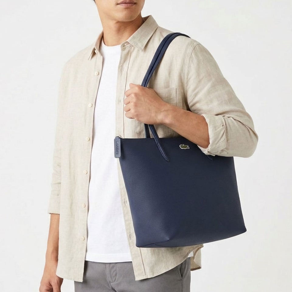装飾を抑えたミニマルなフォルムが、ラコステらしい洗練された雰囲気を演出します。ブランドを象徴するワニロゴがさりげないアクセントとなり、上品な存在感をプラス。カジュアルからきれいめまで幅広いコーディネートに合わせやすいトートバッグです。