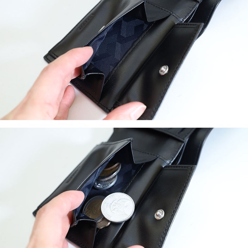 小銭入れにはスナップボタン式のコインポケットを採用。しっかり閉じることができるため、小銭がこぼれる心配が少なく安心して持ち歩けます。使いやすさと安全性を両立した設計で、日常使いでも快適に使用できる便利なディテールです。