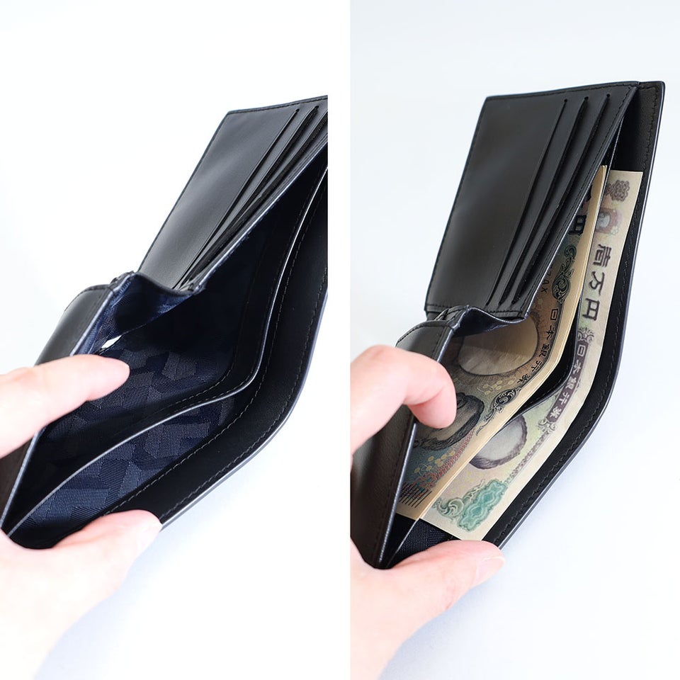 内側にはカードスロットと札入れを配置し、日常で必要なカードや紙幣をしっかり収納できます。札入れには仕切りを設けることで紙幣を整理しやすく、使い勝手も向上。シンプルな構造ながら、毎日の会計をスムーズにしてくれる実用的な収納設計です。