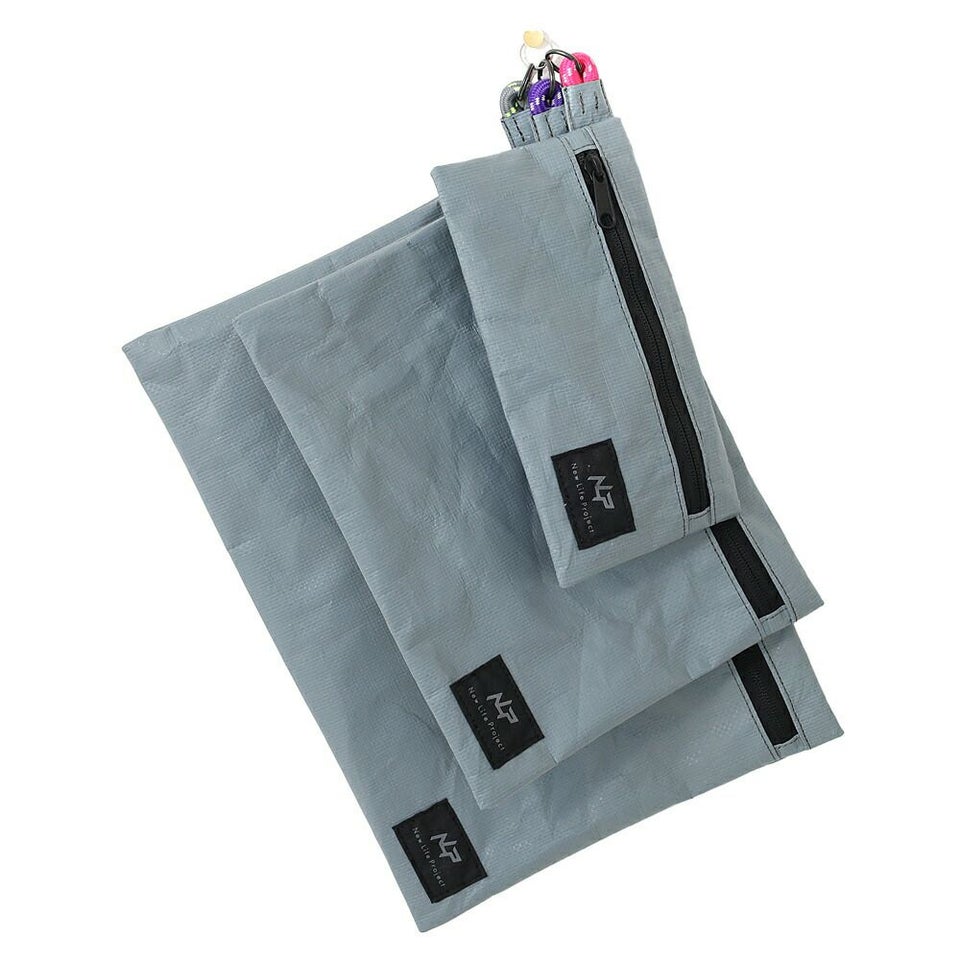 生地のコーティングに廃棄物をアップサイクルした再生原料を使用し、900デニールの厚みで非常に頑丈で、摩擦などへの耐久性も高いポーチセットです。