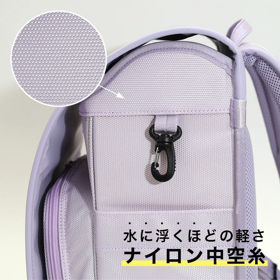 リュックにも使われる「ナイロン中空糸」を本体生地に採用。糸の中が空洞になっており、従来のナイロン繊維に比べて約30%の軽量化を実現しました。丈夫さはそのままに、水に浮くほどの軽さでお子様の毎日の通学をサポートします。