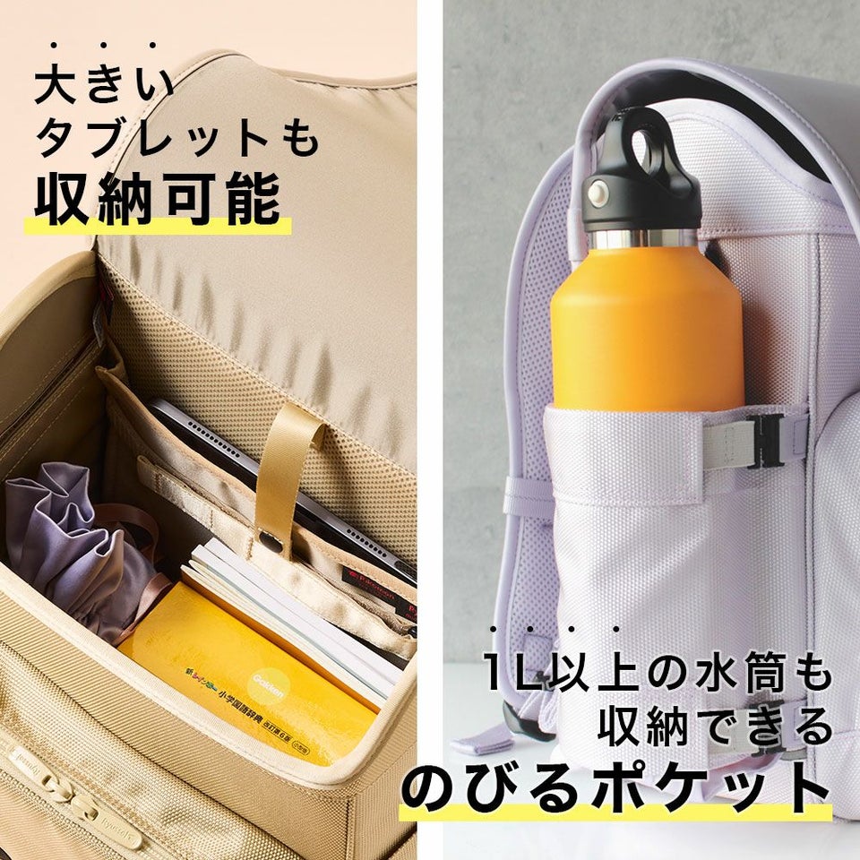 大きめのタブレットが入る専用ポケットを搭載。テープを伸ばすことで、最新の大型サイズにも対応しています。1L以上の水筒も収納できる「のびるポケット」も採用し、日々の通学に必要なアイテムをしっかり持ち運べます。